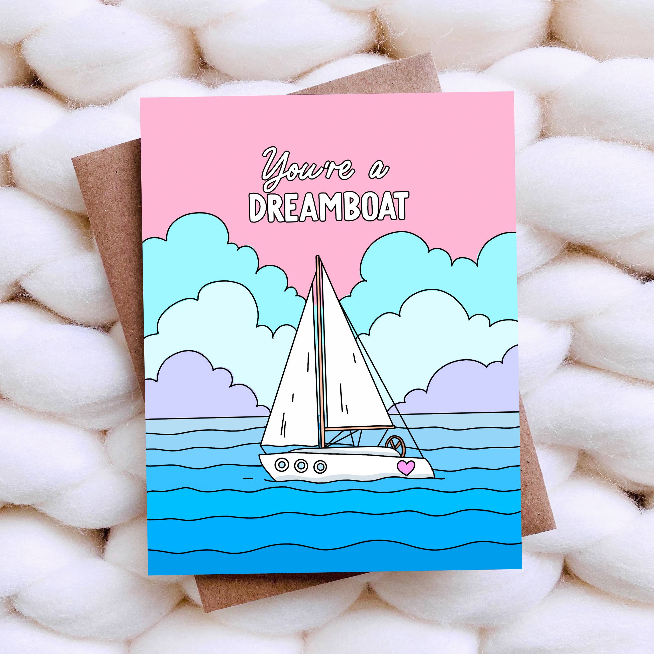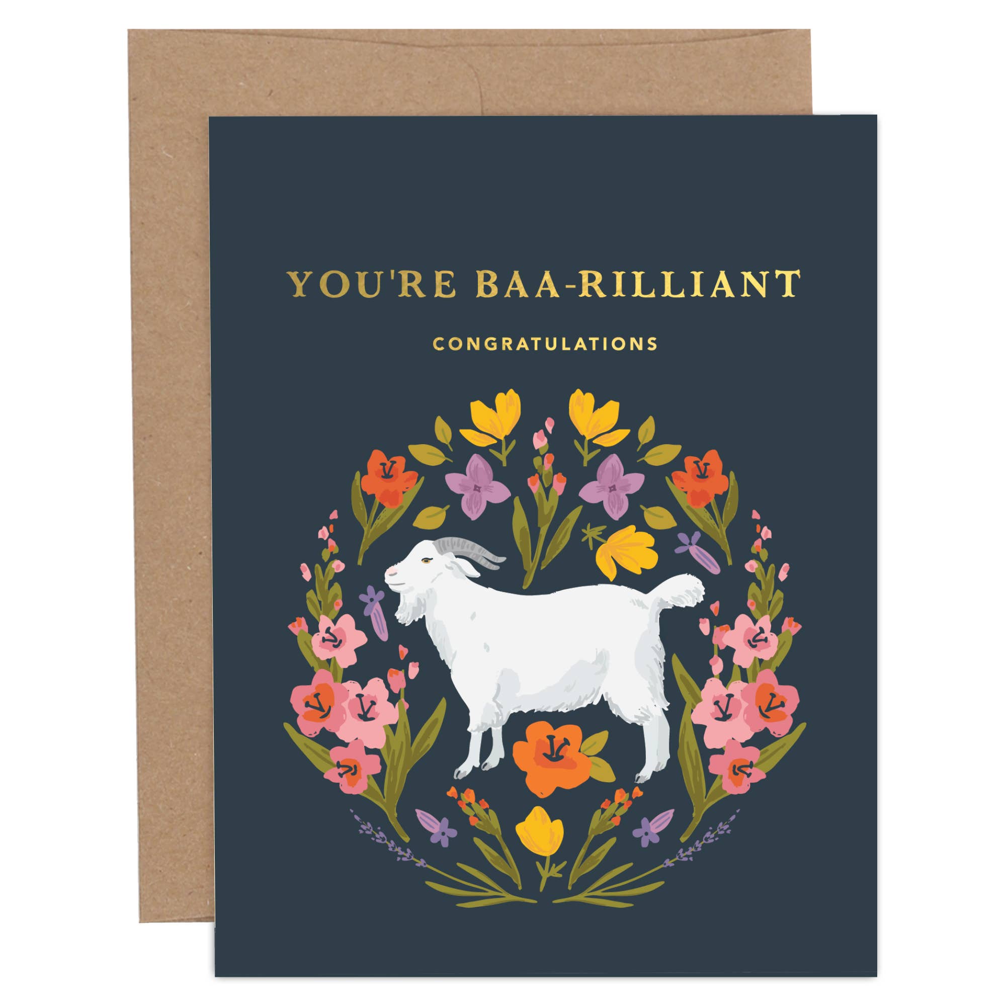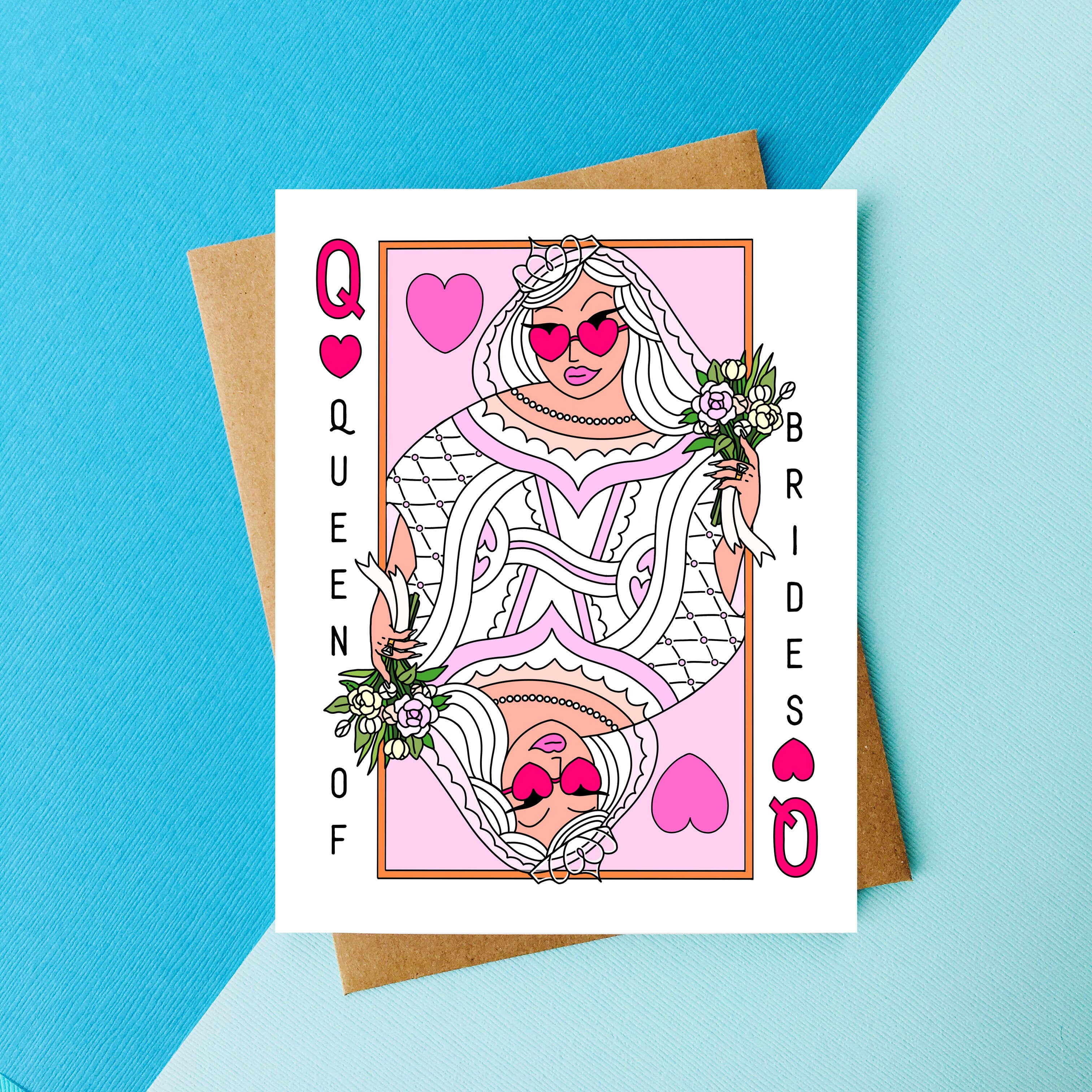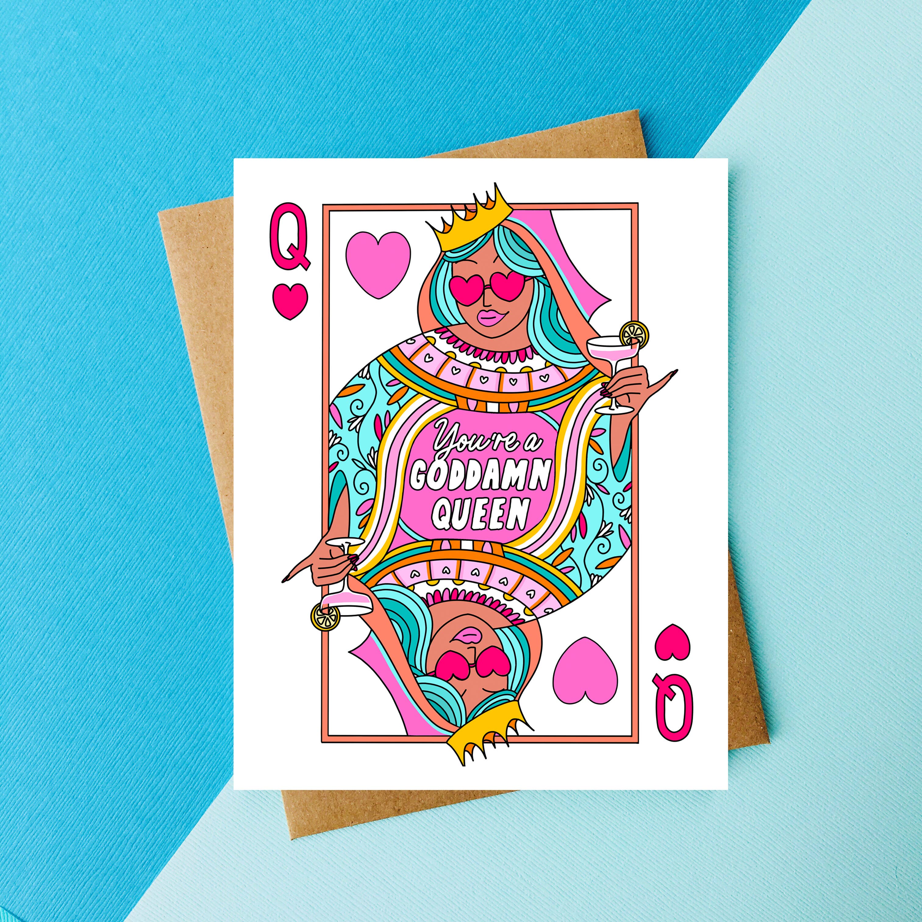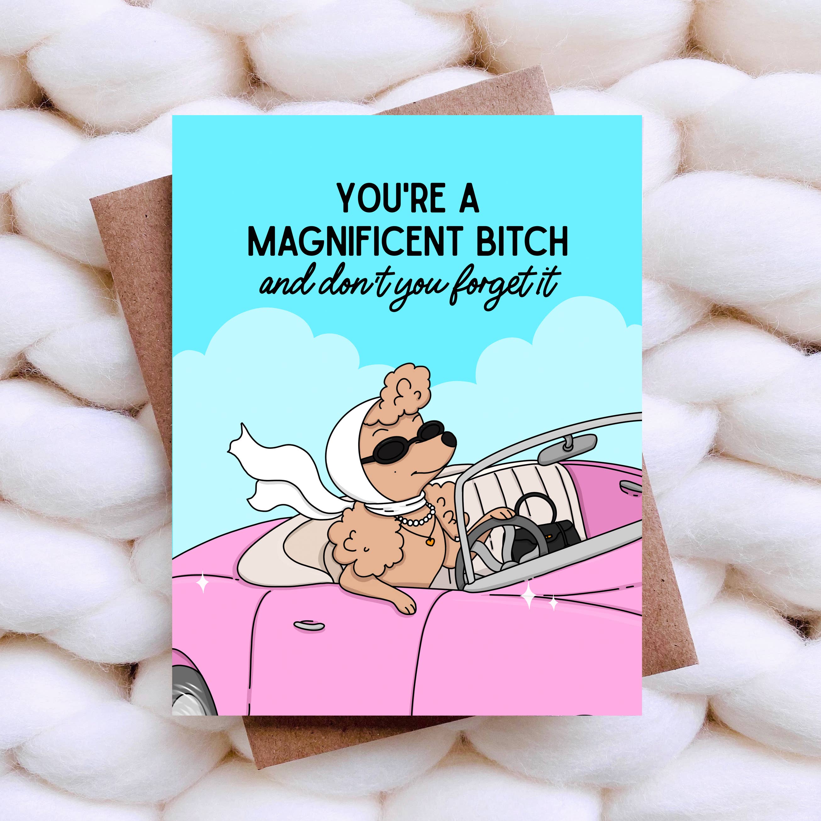 This cheeky card is printed on high quality card stock that makes the ink really pop. It comes display shelf ready, with a fabulous envelope and an earth friendly compostable sheath. The card measures 4.25 x 5.5 inches and is blank inside. All our cards are conceived and fulfilled in-house while our little dog supervises.