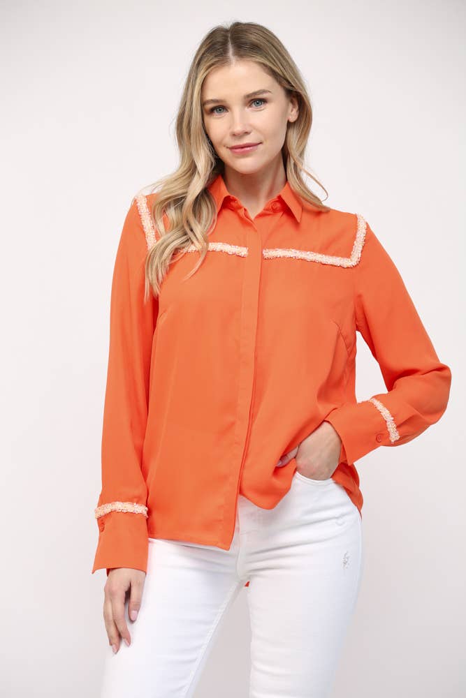 Shoulder ruffled sleeveless shirt blouse in linen fabric. This classic sleeveless collared button up shirt features ruffled shoulder detailing cascading to the waist and a relaxed fit in textured linen fabric. It can be made into a set with shorts style P-3340-P.