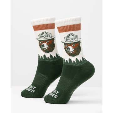 The Prevent Wildfires Sock is made with GOTS certified organic cotton, featuring Smokey's logo set within a tree scape. Show your commitment to prevention with this stylish sock, 10% of each purchase going to the US Forest Service. Prevent wildfires and look great doing so. Quick Specs: * Unisex Fit * GOTS â„¢ Certified Organic Cotton * Available in 2 sizes: S/M (male 5-8.5) and L/XL (male 9-12.5) * Modest Arch Support * Reinforced toe and heel box