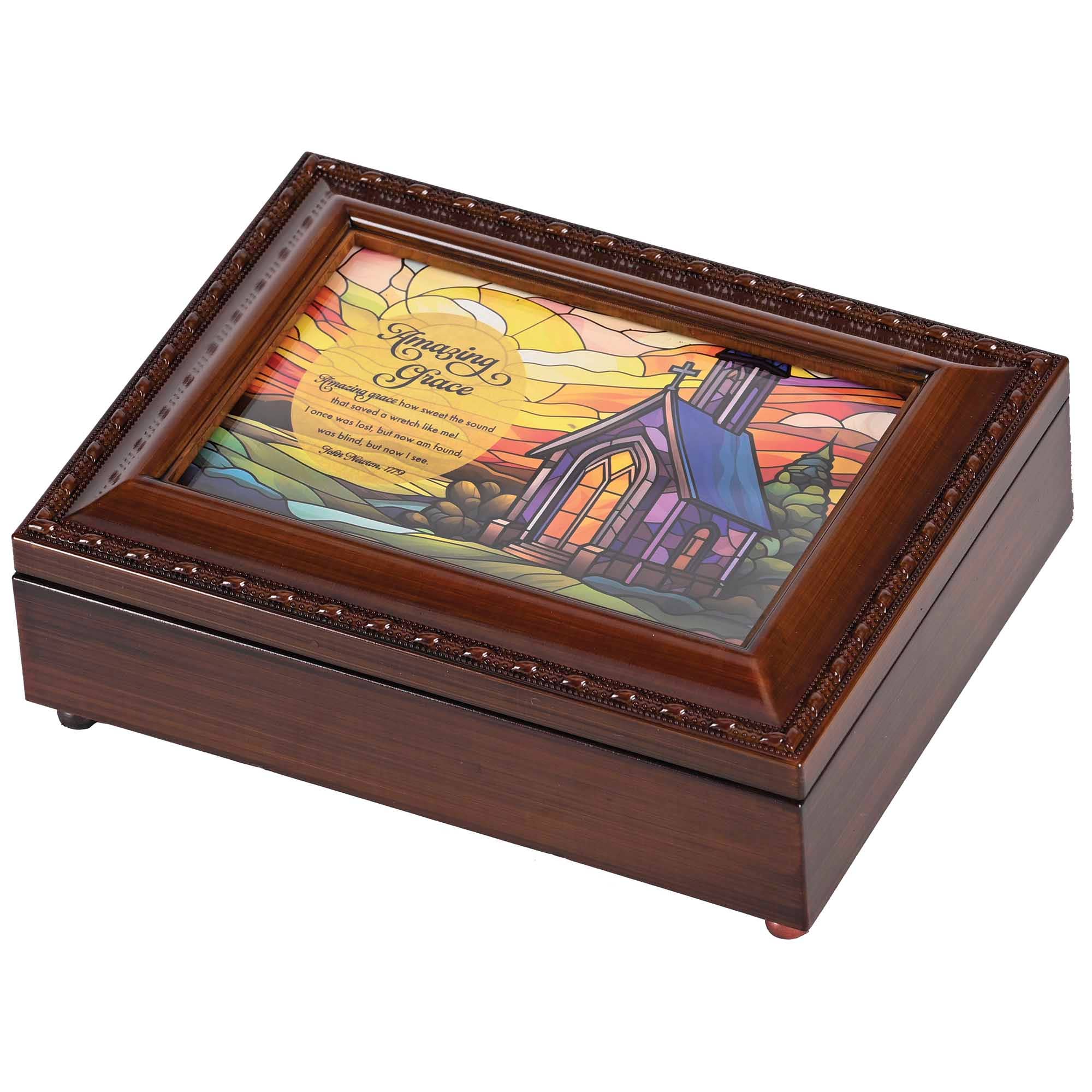 Petite size keepsake box is set with amber, gray and clear sparkling stones in a dainty antique silver beaded trim. Edges of lid and sides of box have a warm pewter brushed finish, with a subtle metallic shimmer. The hinged lid is also a photo frame; it comes with a lovely art print, under glass, with sentiment. Print can easily be changed out for a favorite photo cut to 2 3/8" x 4 5/8"; window size at top is 4" x 2". Inside box is a smaller compartment with clear glass top that shows the high quality Sankyo musical movement. When key under box is wound, music will play when lid is open and stop when it is closed. Plays the song "Wind Beneath My Wings." Storage compartment has a luxurious black velvety lining. Decorative legs on bottom are padded to protect furniture. Box is made of a super-sturdy polymer that resists cracking and chipping. Overall size is 6" x 4" x 2 5/8".