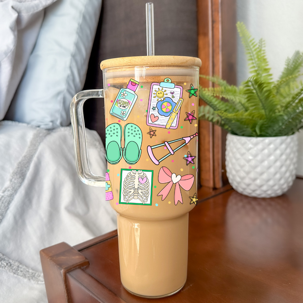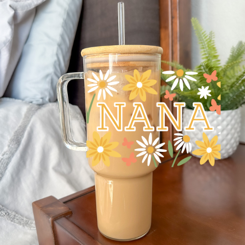 40oz Glass Tumbler with Handle & Vinyl Design Stay hydrated in style with this 40oz Glass Tumbler with Handle, available in clear or frosted glass. Featuring a permanent vinyl design, it's perfect for everything from refreshing water to your favorite iced beverages. The tumbler comes with a bamboo lid and reusable straw, making it both eco-friendly and practical for everyday use. Key Features: * 40oz capacity, clear or frosted glass options * Permanent vinyl design, customizable to your style * Includes bamboo lid, handle, and reusable straw * Optional laser-engraved lid to match the design * Handwash only to preserve the vinyl and bamboo lid Ideal for gifts, personal use, or promotions, this tumbler offers both style and functionality. Sip in comfort, whether at home, work, or on the go!