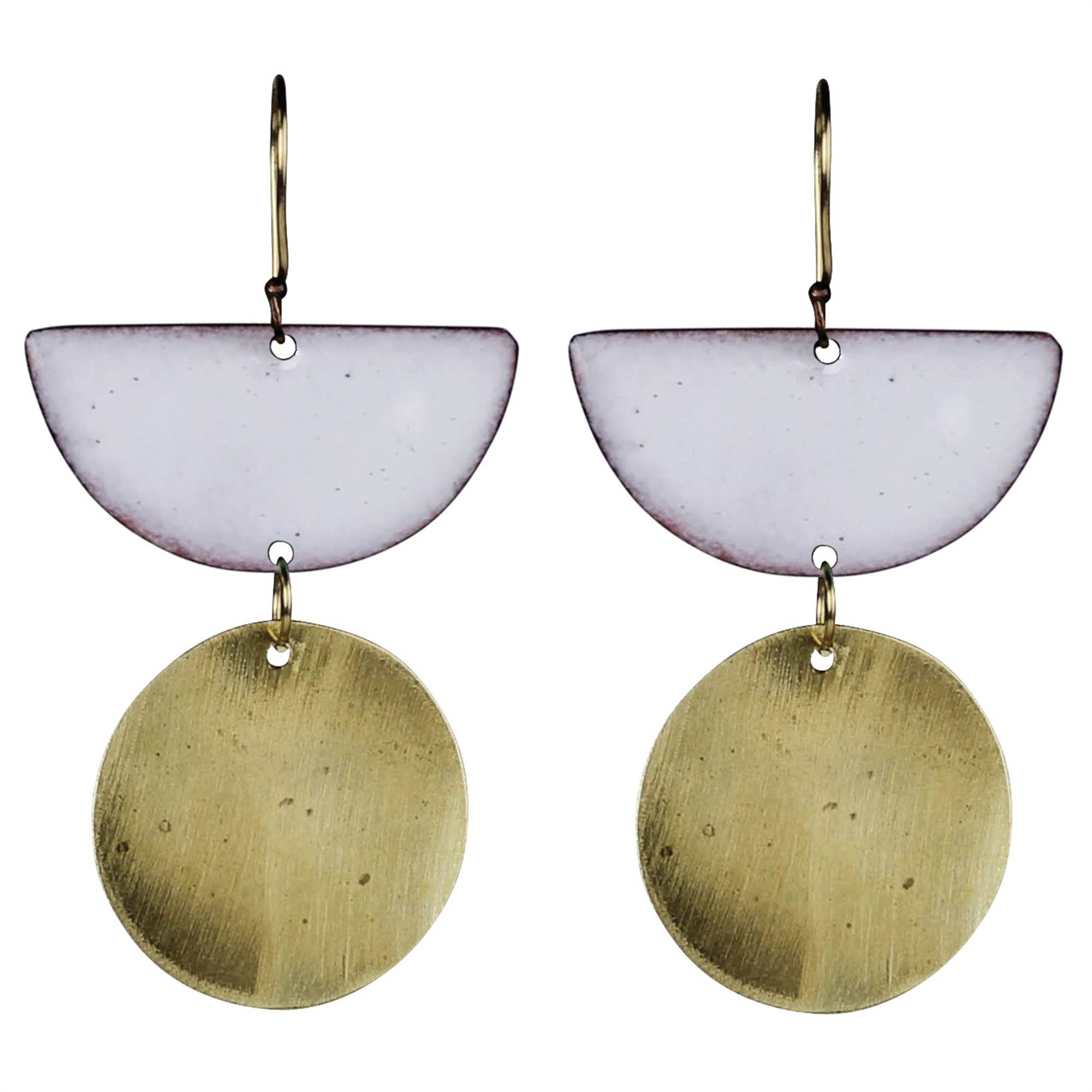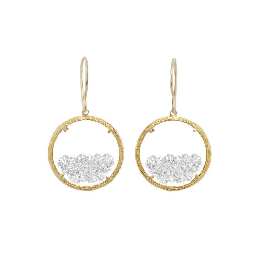 Wavy disc dangle earrings. These drop earrings feature a high polish finish and multiple clusters of small crystals. PRODUCT DETAILS Materials: Pewter casting with 24 kt gold plating / Sterling silver plating / Rose gold plating. Cz stones Measurements: 1.5" long