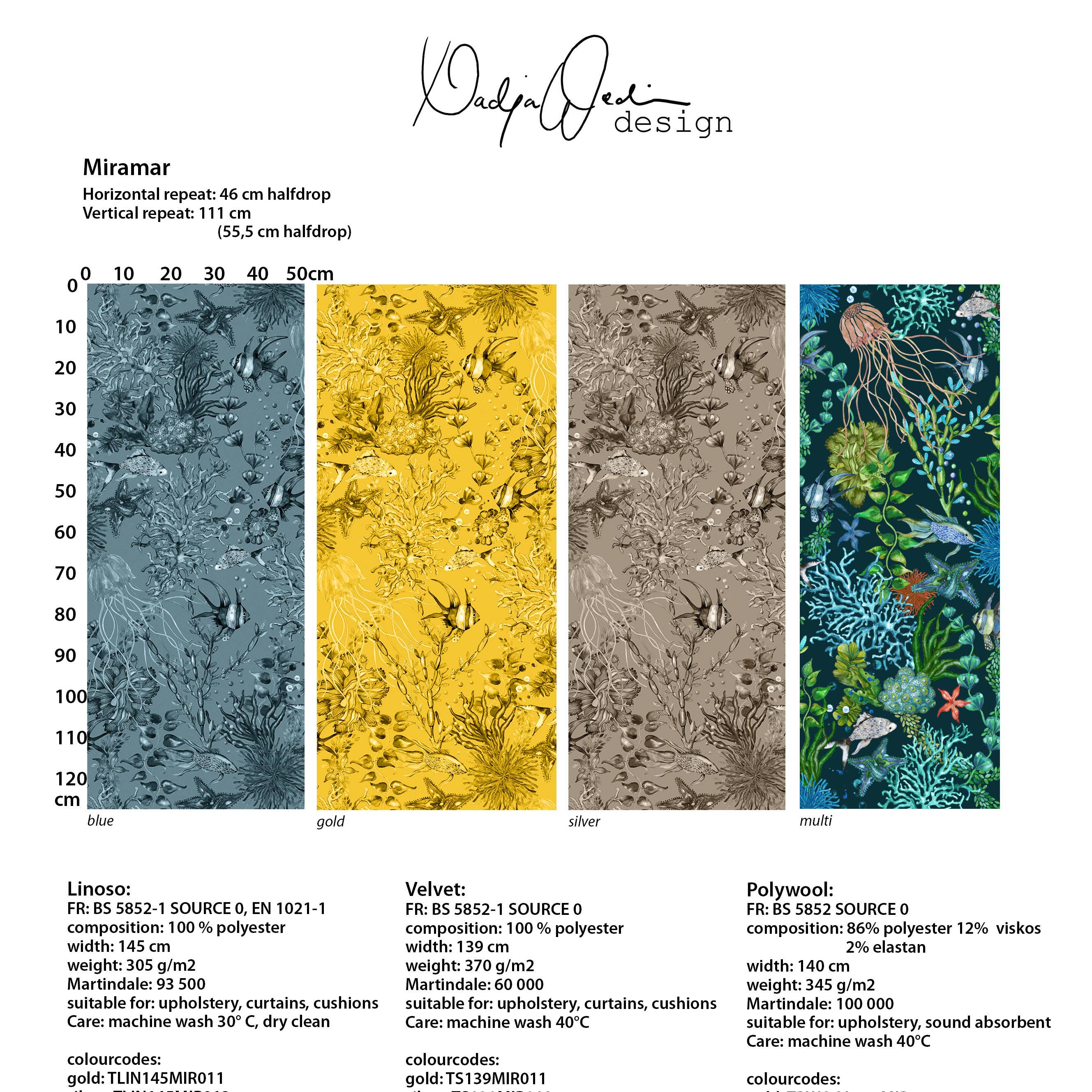 Fabric sample hanger with pattern Ivy (4 colors). The hanger consists of a pattern report of each pattern and color variant in the upholstery velvet quality, as well as print samples of the pattern in two additional upholstery fabrics: Linoso and Polywool. The fabric sample hanger can be purchased separately to complement previous purchases, but to receive a 30% purchase discount on fabrics from Nadja Wedin design, you must have at least seven hangers in your assortment. Currently there are a total of 14 hangers with a total of 19 designs by Nadja Wedin. Some of the hangers thus contains more than one pattern, because these only have one or a maximum of two color variants. In total, all 14 hangers provide 19 patterns in 62 different colors. When buying seven hangers, you get a 15% discount on the price of the hangers. When buying all 14 hangers, you get a 20% discount on the price of the hangers. None of the patterns will ever expire, as we always print on demand.