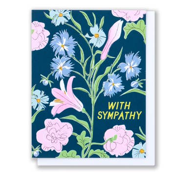 'With Deepest Sympathy' Card. Original Illustration, printed digitally. Each card is printed in full rich color, giving a fun and punchy color effect! 100 lb matte white paper, folded They look good and feel good! 4.25 x 5.5 A2 size Includes white envelope and clear sleeve These card designs will bring joy into your shop!