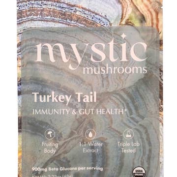 SKU: 850062126077 Made in United States Ingredients: Organic Turkey Tail Mushroom Extract Occasion Theme: Everyday Production: No artificial sweeteners, No preservatives, and Non-GMO Season: Year-Round Shelf life: 24–36 months Storage: Shelf-stable Diet: Alcohol-free, Dairy-free, Gluten-free, Grain-free, Nut-free, Organic, Paleo, Plant-based, Sodium-free, Soy-free, Sugar-free, Vegan, Vegetarian, and Whole Foods Product Language: English Weight: 85.05 g (3 oz) UPC: 850062126077 Product Materials: Organic and Vegan Packaging: Recycled Production: Ethically sourced