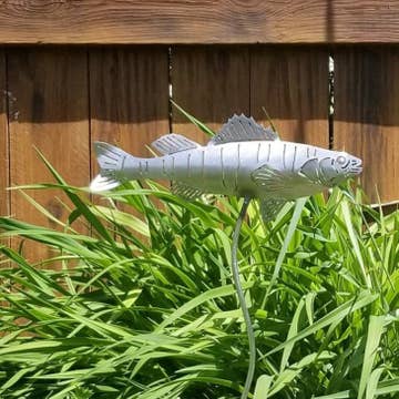 This steel perch garden stake would be a welcome addition to any fishing enthusiast's garden. Cut from 20 gauge steel and welded to a sturdy 1/4 inch stake. There is a glass marble for the eye (marble color may vary). There is a triangle welded at the base for easy step-in. Measures approximately 12" x 32 1/2" (including the stake). Each fish is hand formed to create a slight curve of the body and fins. This piece will weather naturally and turn a dark brown patina. Item will come in various states of rusting process. Please note: this piece contains small glass marble(s) that are not suitable for children and may pose a choking hazard.