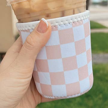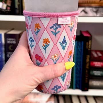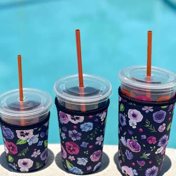 • white flower pattern on a purple background w/ purple sleeve rim • hand-drawn original design • neoprene material keeps your drinks cool and your hands dry • the small size will fit best on 12/16oz drink cups (Starbucks tall/grande or Dunkin' small) and is 4" tall • the medium size will fit best on 24oz drink cups (Starbucks venti or Dunkin' medium) and is 5" tall • the listing image shows a medium sleeve on a Dunkin' medium drink