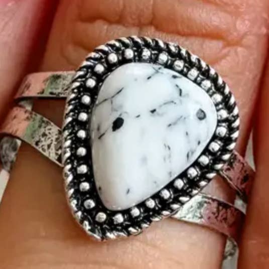 Bolt Ring | Western Lightning Bolt Adjustable Stretch Ring | White Turquoise Black Ring | Anilo | Accessories | Jewelry Lightning bolt Stone Cuff Ring - Burnished Silver - adjustable/ stretches - Approximately 1” long - take off to wash hands or to use lotions