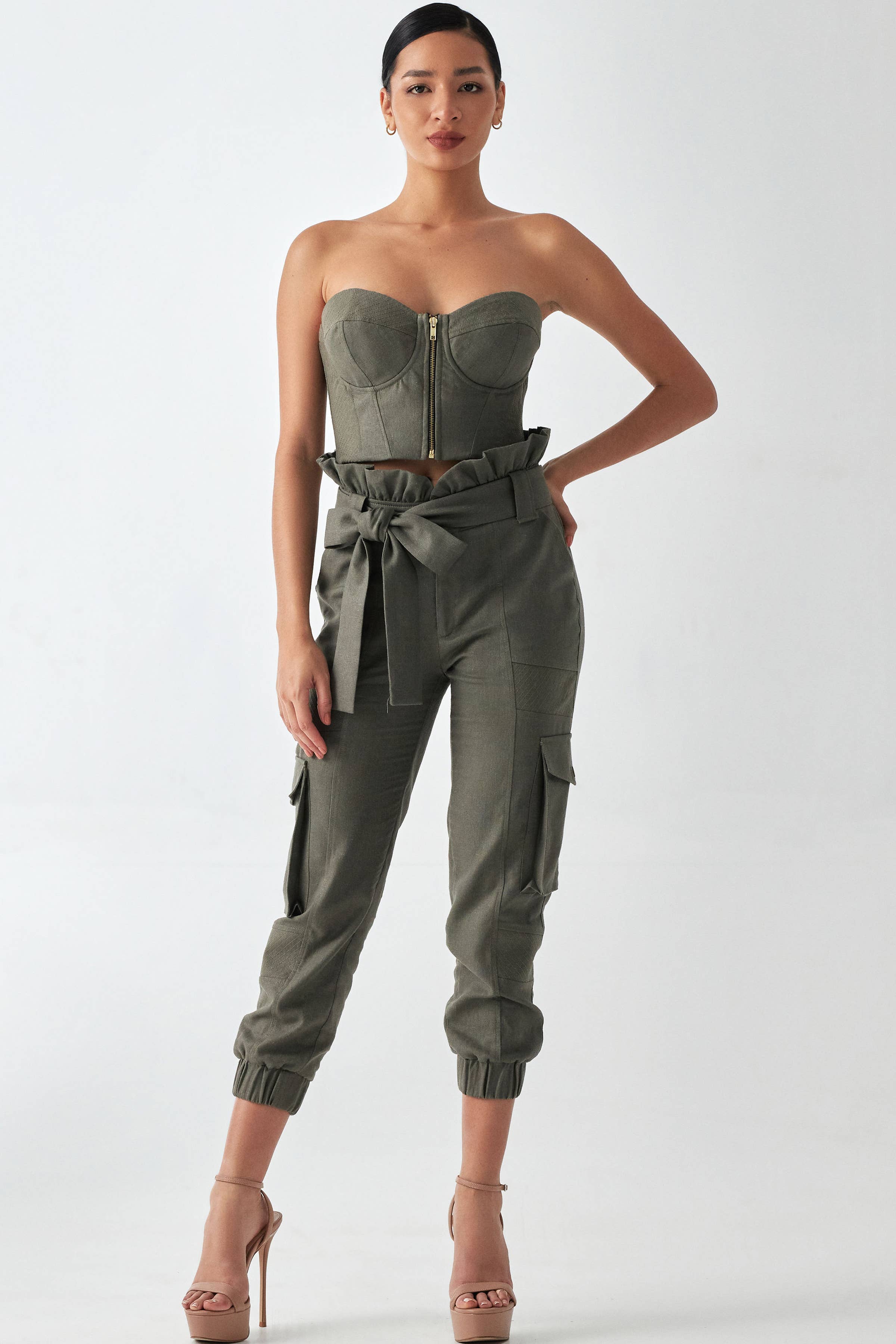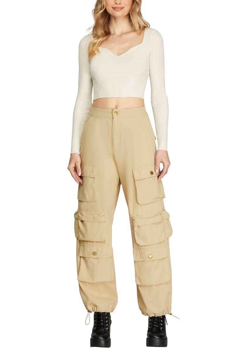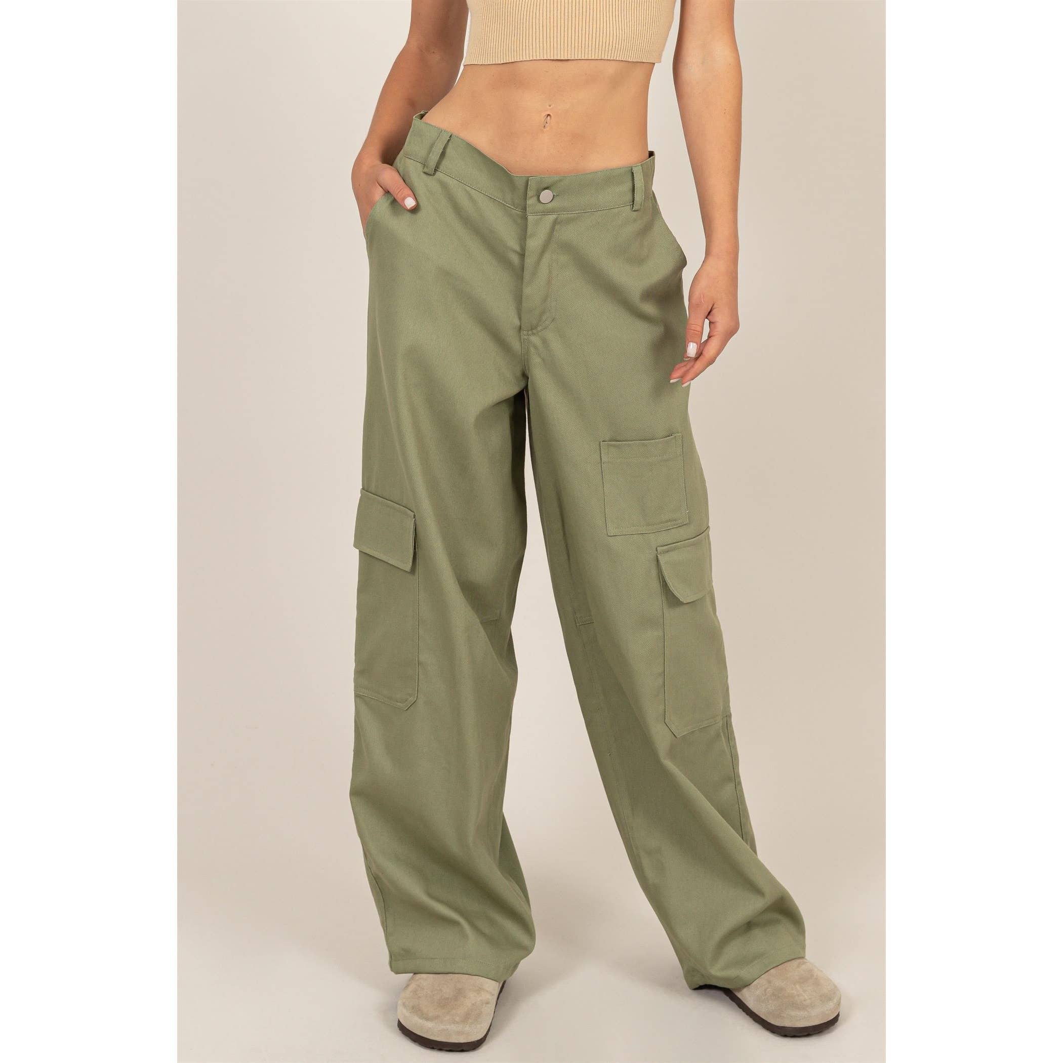 - Features: Low rise waist with elasticized drawstrings, Side cargo pockets with straps, Full length bodice, Relaxed fit silhouette., - Fabric: Lightweight breathable nylon woven fabric that has no stretch., - True to size Body Size: Contemporary Pattern: Solid Length: Full Low Waisted Fabric: Nylon