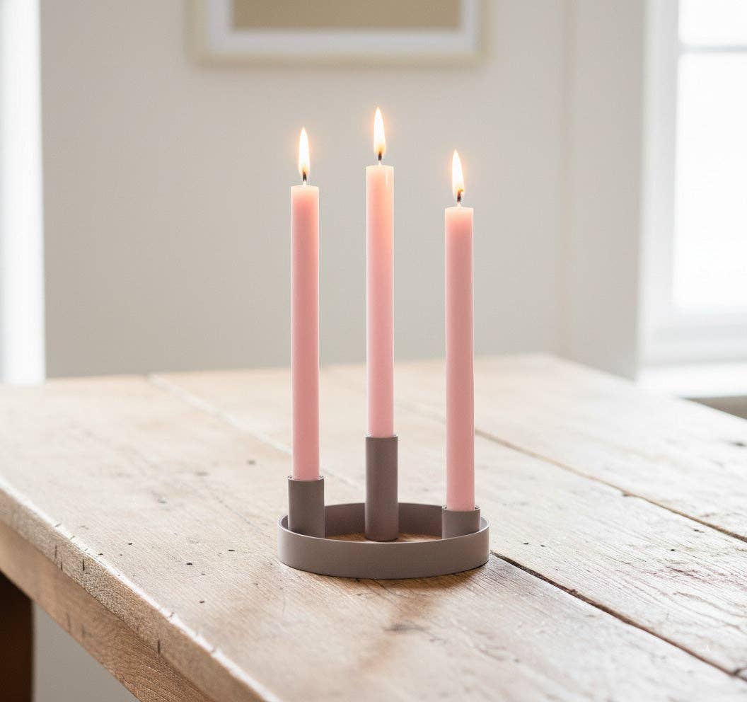 A simple, oval Candelabra in Beryl Green designed for 6 candles, placing them at varying heights for a dramatic effect on the table. Our candelabra fits a standard sized dinner or taper, just add our striped and solid eco candles for a spectacular, tonal effect! Boxed in a simple, easily recycled Kraft card box. Handmade in India from Mild Steel, Painted. Fully Recyclable. 30cm x 13cm 11.81'' x 5.11'' Holder heights at 4cm, 6cm & 8cm / 1.57'', 2.36'' & 3.14'' * Candles sold separately Candleholder safety note: * Stop burning when 2cm of any unmelted candle remains and leave at least 10 cm between candles. * Never leave a burning candle unattended. Pictured here with Grass Green Candles