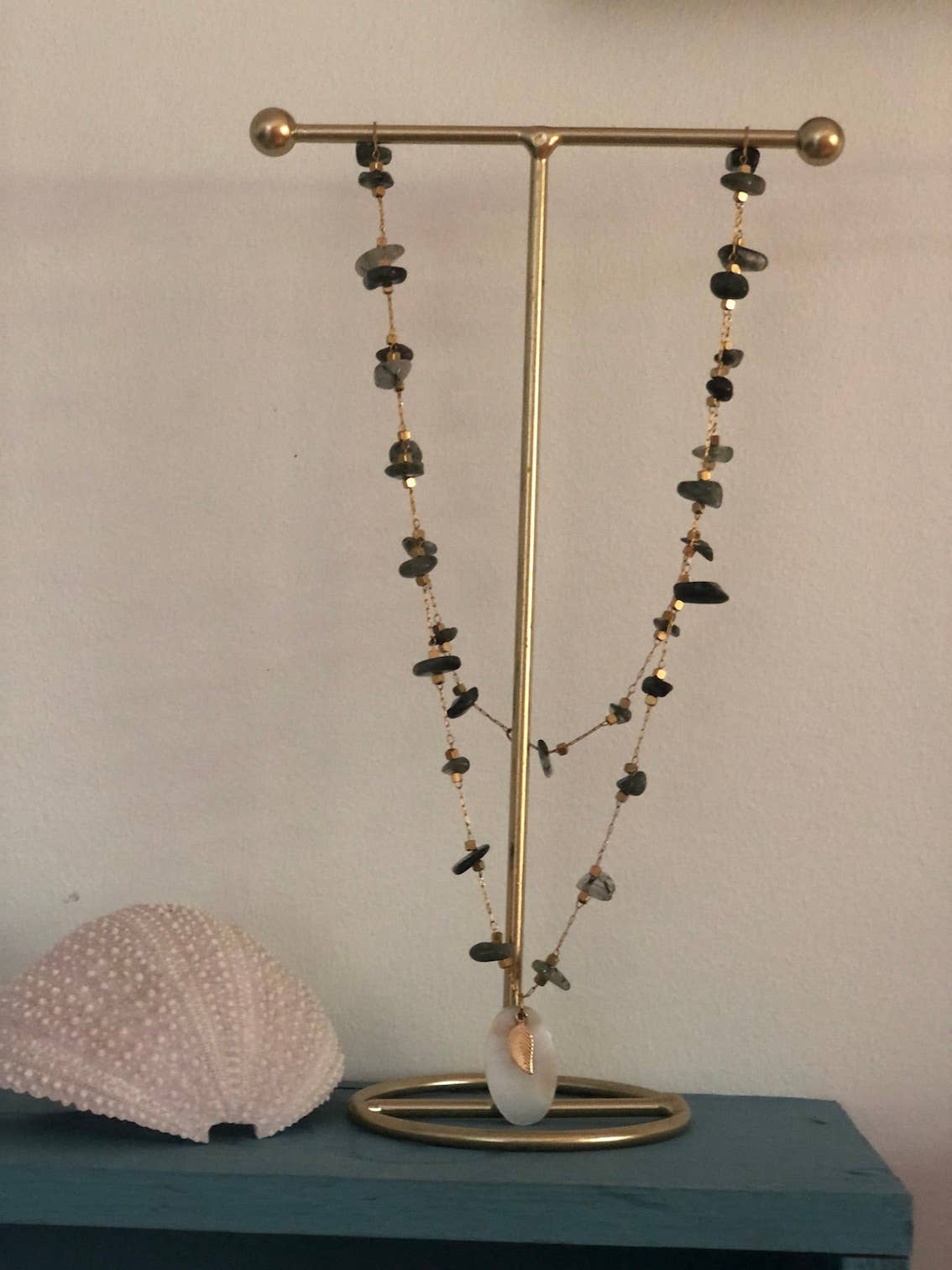 The chain is made of Gold Filled. It is decorated with mother-of-pearl and gold plating Length of the jewel: 80cm