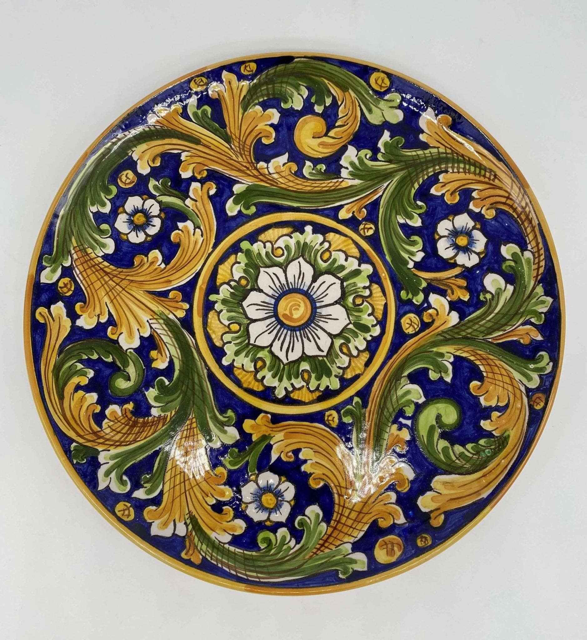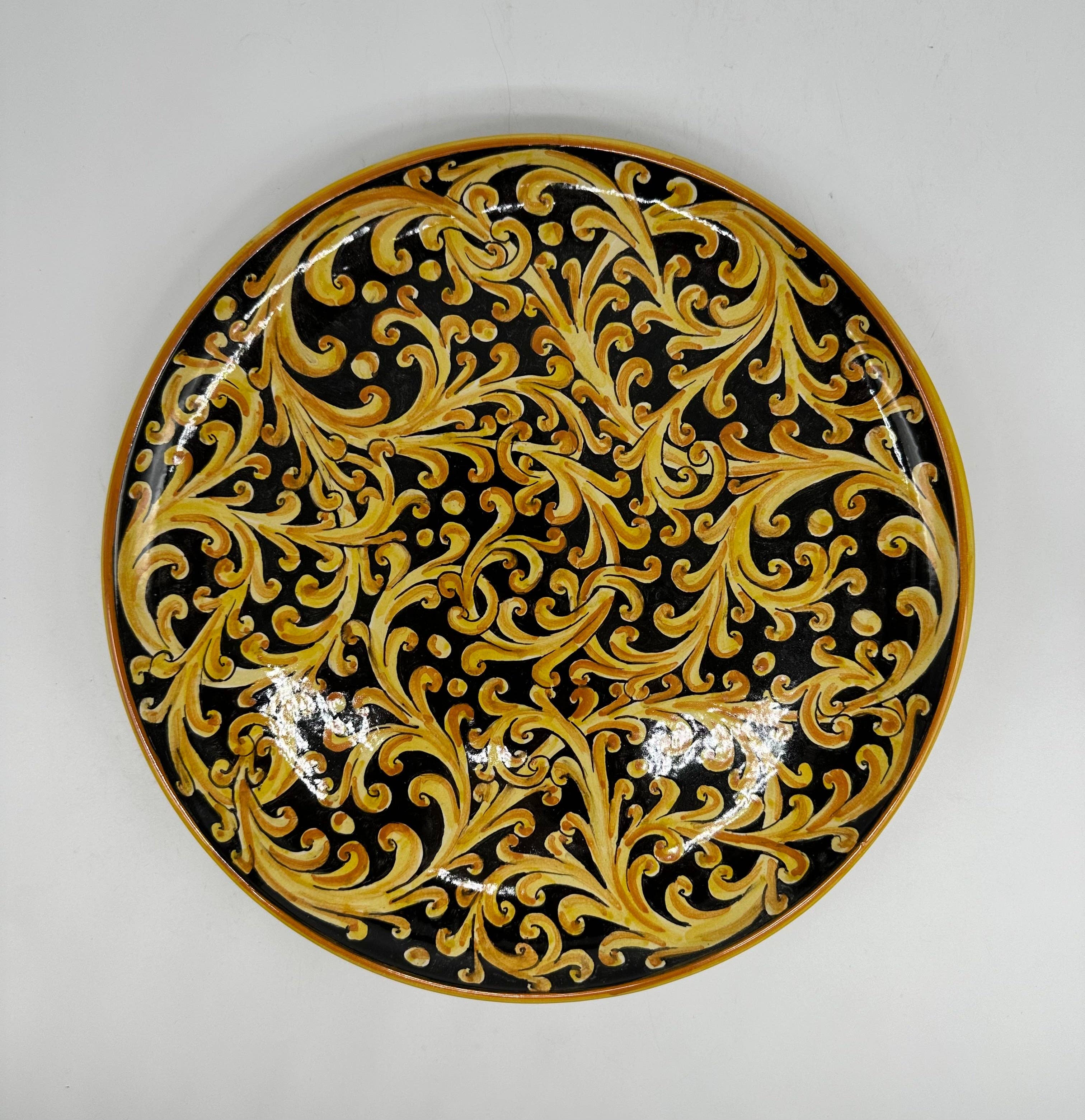 Wall plate entirely created and painted by hand in all its parts. Signed with the company's ceramic inscription, already prepared with holes for hanging. “Venus” decoration in shades of Ochre Diameter (cm): 30 It is worth noting the well-defined details and the quality of manufacturing art. On request we can make the same kitchen plate (with certified food grade enamels).