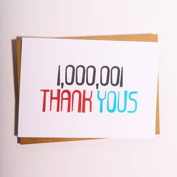 Thanks A Million! Send your gratitude with this 5x7 greeting card! This card comes with a Kraft paper envelope and is blank inside to customize with your own note.