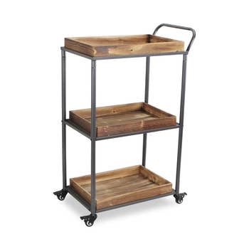 The Danya B Rustic Walnut Veneer and Metal Rolling Wine Bar Cart offers an all-in-one wheeled drink station with plenty of storage and style alike. This antique inspired serving cart features chic metal hardware to hold up to twelve wine bottles and several wine glasses. Three optimal wooden trays also allow for easy access to and display of other home bar items and accessories such as wine openers, other liquor bottles, and charcuterie boards. There is also plenty of space in the two larger trays or one smaller tray to display your favorite decor and trinkets such as candles or wine cork collections alongside your barcart accessories. The wheeled trolley design, complete with handle and four locking wheels, provides further portability while entertaining throughout your home. The warm walnut wood tone combined with industrial metal accents deliver a charming farmhouse drink station to enhance any cozy, tranquil night in or elevate your next elegant dinner party gathering.