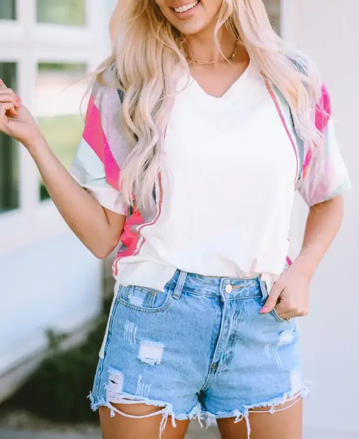This short sleeves top, has a round neckline a solid front, with a aztec print contrast at back. Model/Picture information Height: 5'8 US Size: 2 Bust: 33" Waist: 25" * Model wears a size small* ** ALL accessories are not included**