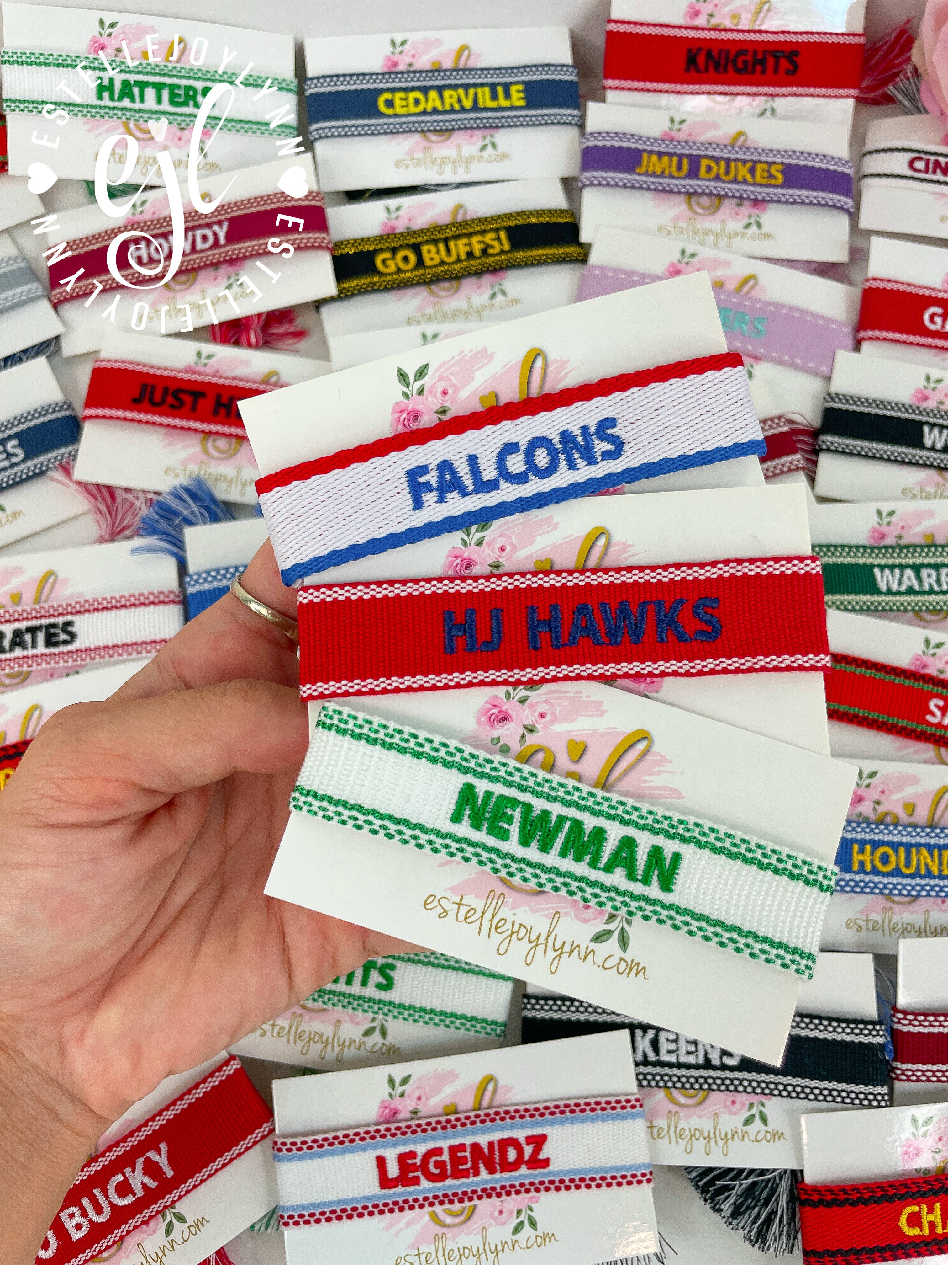 CUSTOM School Spirit Embroidered Bandanas | PERSONALIZE your team or favorite player on a bandana | Choose Your Team Colors & Team Words Show your team spirit with our exclusive School Spirit Bandanas, Wear as a headband, scarf, on your purse strap, belt loop or anywhere you can show Team Support All Bandanas embroidered with Vintage Chain Stitch Embroidery **Colors/shades of bandanas may vary depending on availability** ***Choose your Bandana Color, Thread Color and school spirit personalization up to 10 letters maximum*** CHOOSE THE COLORS OF YOUR FAVORITE FOOTBALL TEAM, BASEBALL TEAM, CHEER TEAM, etc. **NO TRADEMARK NAMES** Please note: This listing is for lettering only. All Bracelets, Hats & Accessories are designed, curated & embroidered by the EJL Team in the USA © Copyright EstelleJoyLynn, LLC Follow us on Instagram & Tag us in your photos