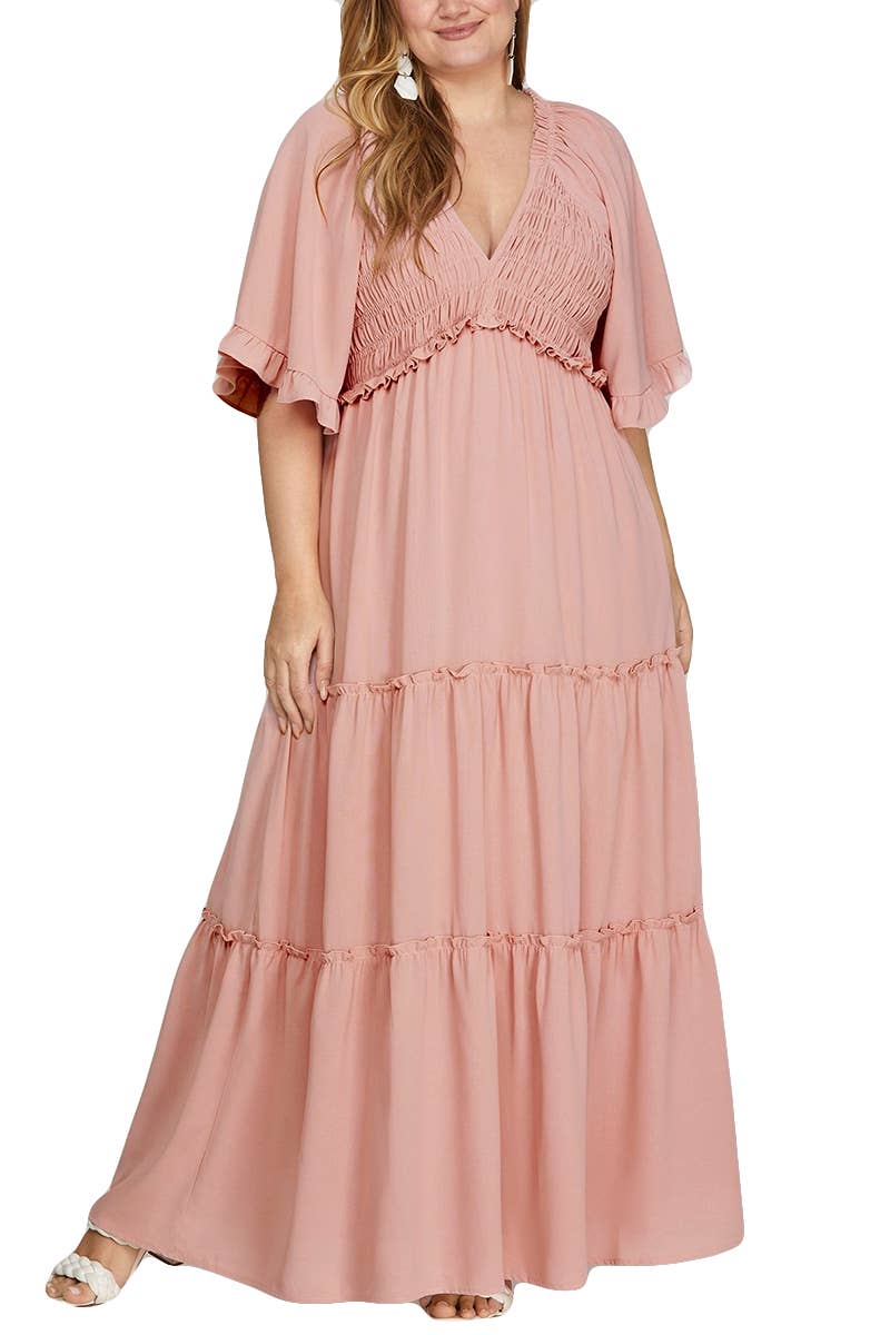 This red dress features a square neckline, short puff sleeves, and a softly gathered bodice with vertical pleats at the empire line. Made from a flowing fabric, it transitions into a relaxed A-line skirt that falls to the ankles. The back includes smocking above the waist for comfort and ease. It’s simple and elegant silhouette is timeless and refined.