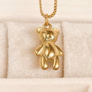 ***For US customers: No surprise tariff or brokerage fees. Any fees shown at checkout are fully covered upfront, with no extra charges on delivery. We take care of everything so customs is seamless for you. This 16-inch teddy bear pendant necklace, with a 2-inch extender, features a 12x20mm pendant made of stainless steel with an 18k gold PVD plated finish. Material: Stainless Steel Finish: 18k Gold PVD Plated Length: 16+2" Pendant Size: 12x20mm FREE RETAIL-READY PACKAGING Each item is carefully packaged for a polished presentation. Earrings come on off-white square cards featuring our logo (BEJ or Blueye Jewelry) and the material (stainless steel or sterling silver). Necklaces and bracelets are packaged on small cards with our brand name on the front and material on the back, then placed in long white polybags. Rings are packaged WITHOUT cards in zipped bags with size stickers. If you prefer to use your own cards, please let us know, and we will package your items without using our branded cards. *We offer personalization. Please contact us to customize your pieces.