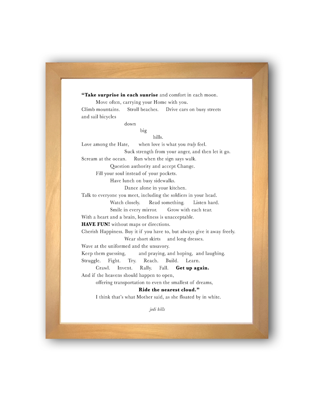 This is part of an album streaming on all of your favorite platforms. Search "The MoMeMans" on Spotify, Apple Music, Amazon Music, Pandora, or wherever you stream! Five Keep Five by your side when you’re feeling fried. He can throw you a line, get you feelin’ fine. He can be your guide, put worries aside. Make you feel alive with the gift of a high five. PRINT DETAILS * Archival, Acid-free matte paper, Thick, Durable * Museum-quality * Printed in USA FRAME DETAILS * Alder, semi-hardwood frame, made from renewable forests * Available in black or white * .75” thick * Acrylite front protector * Hanging hardware inlcuded * Made in USA