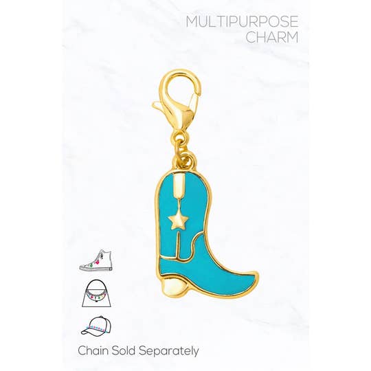 Whether you're a fan of rodeos, country music, or the freedom of the heartland, this cowboy boot charm is the perfect way to showcase your cowgirl spirit. Show off your independence, bravery, and love for wide-open spaces. Charms are 3-dimensional and look great from every angle. AVAILABLE STYLES: - Charm on Card - Charm - un-carded - Charm Bracelet - 7 1/2” brass hook bangle - Charm Necklace - 18” antique bronze ball chain ARTISAN TOUCH: Our skilled artisans hand-paint each charm in Denver, CO. MEASUREMENTS: Charms are approximately 5/8” and come with a jump ring to easily attach to your favorite bracelet, necklace, or keychain. HYPOALLERGENIC: All our accessories are lead-free and nickel-free.