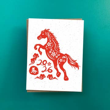 This 2026 Year of the Fire Horse Calendar Card is printed on bright yellow 80lb card stock in red and black ink. The Fire Horse image is from an original lino cut print. Comes with a red and steel blue striped ribbon tied on to hang it upwith. Folded card, 8.5 by 5.5 inches, comes with a pomegranate envelope Folded Card = 4.25 by 5.5 inches, A2 size / Unfolded Card = 8.25 by 11 inches, Letter size The card stock is American made using 100% renewable electricity from a company owned hydroelectric plant and responsibly-sourced fibers and colorants. The envelope is created from paper made domestically from certified mills who practice responsible, sustainable forestry with at least 30% PCW (post-consumer waste) in the content of the item. The ink used contains renewable vegetable oils. All the illustrations and text are original and not intended for copy or reproduction in any form, © 2026 Maia de Raat, Dandy Lion Press, all rights reserved.