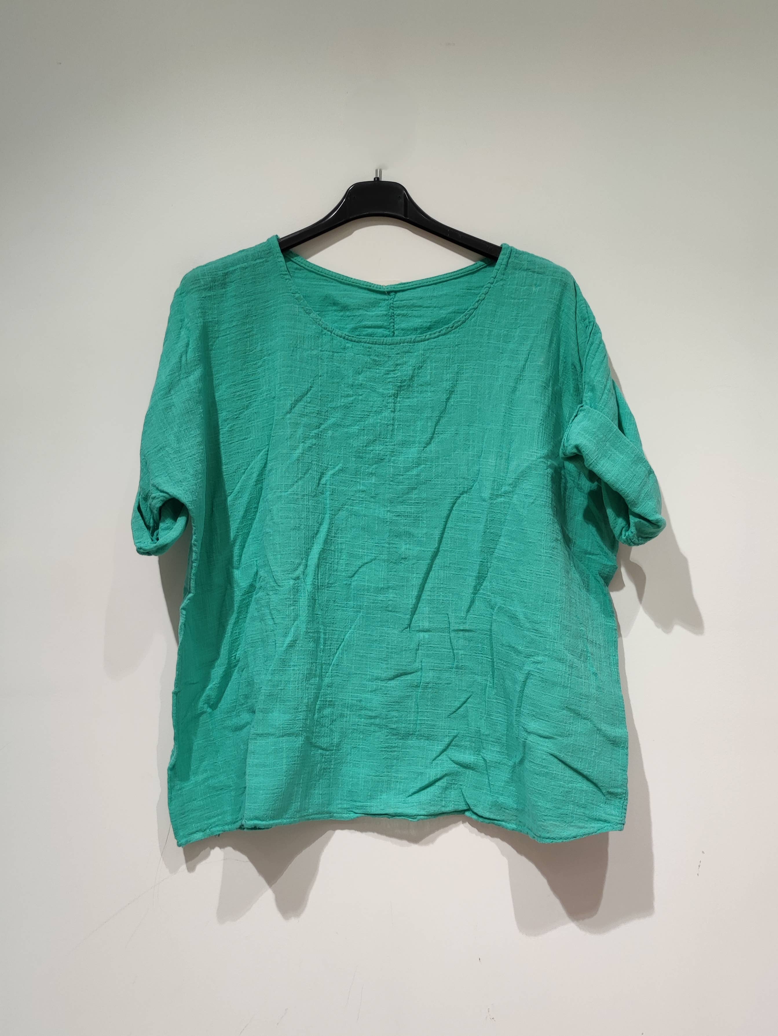 COMPOSITION: 100% COTTON Blouse with one pocket, flared, open mandarin collar, short sleeves rolled up. Front length about 75 cm. Maximum chest size: 120 centimeters Can be dressed from size 36 to 46.
