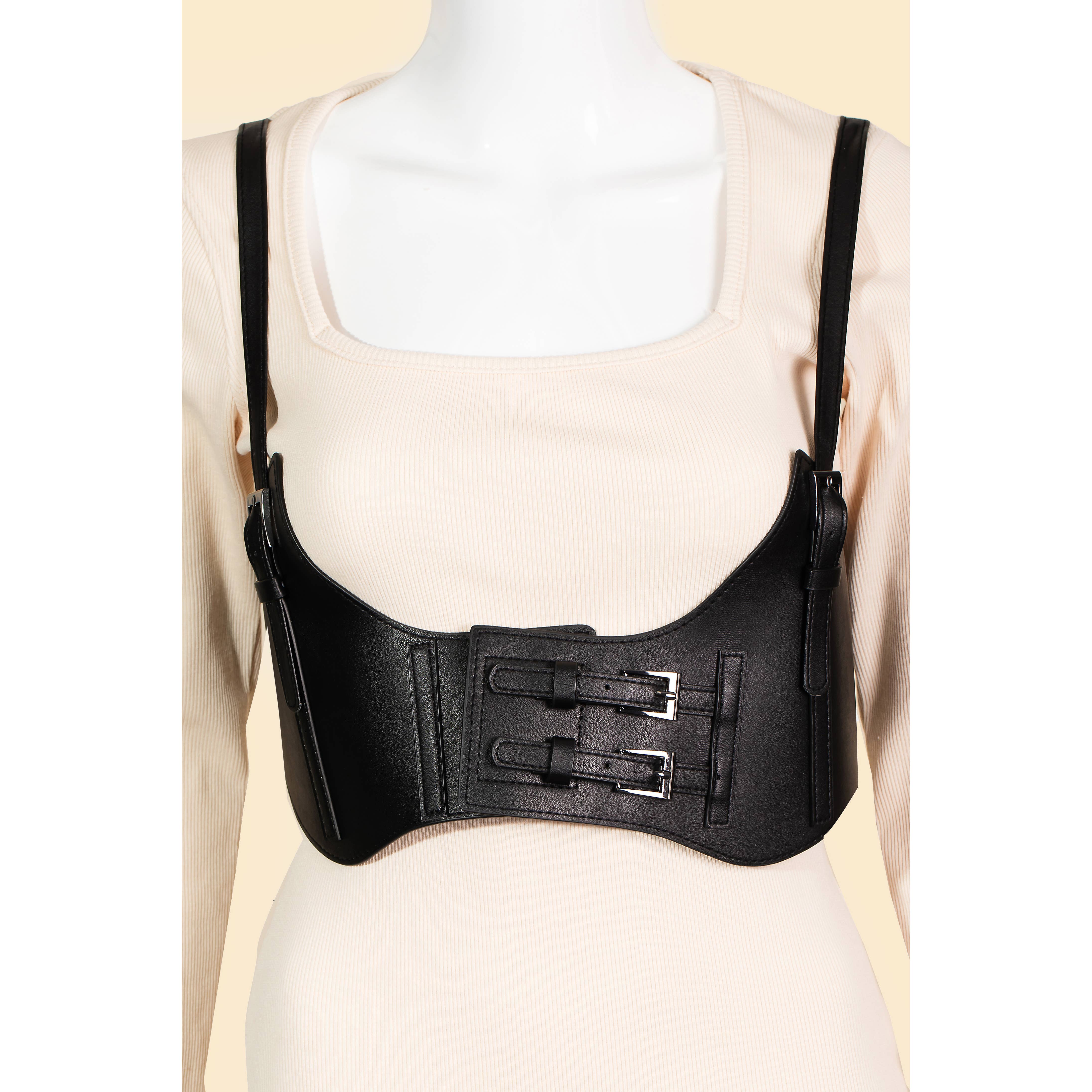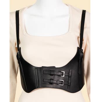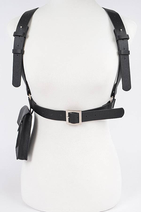 This belt introduces a unique suspender harness fashion style. Immerse yourself in the details of design, as this accessory effortlessly becomes a conversation starter. This belt approximately measures (Inches): H: 30 PL: 38 100% POLYURETHANE