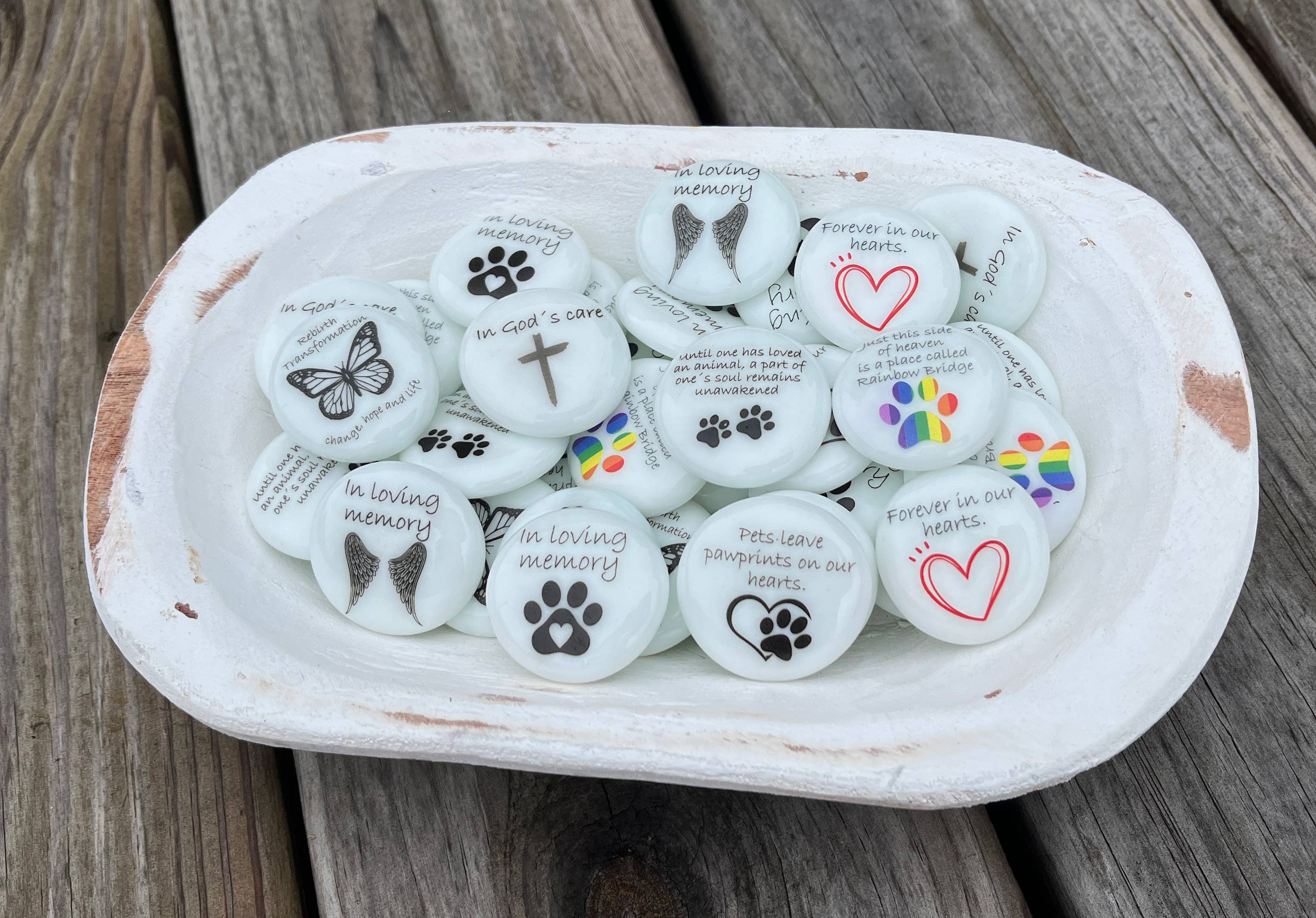 Includes 60 Assorted Sea Stones with small dough bowl display (10" x 6" x 3".) Replica sea glass measures approximately 1 1/2"x 1 1/4" x 1/4" is imprinted with powerful words and will come in an assortment of the following: Balance Be Present Believe Blessings Brave Breathe Comfort Courage Dream Embrace Empower Faith Fearless Focus Forgive Freedom Grace Gratitude Grow Happiness Harmony Hope Imagine Inspire Joy Joyful Kindness Live Laugh Love Love Loyalty Miracles Happen Peace Relax Remember Rise Above Serenity Shine Simplify Smile Strength Success Thankful Thrive Trust Unite Unstoppable Wisdom Worry Less Stones come in a variety of gorgeous sea colors and make excellent stocking stuffers, gifts, party favors, memorials for funerals and talismans. **Important** Dough bowl displays are hand made items, and measurements are not exact. Also, please note that the bowls are made to look rustic and may have knot holes, scratches, blade marks, minor cracks and blemishes. These are not defects, but part of the bowl making process. Bowl will come in natural wood or painted white. Dough bowls are for decorative and display use only. It has not been treated or tested for food safety. It is not rated for candle making or exposure to flame or heat.