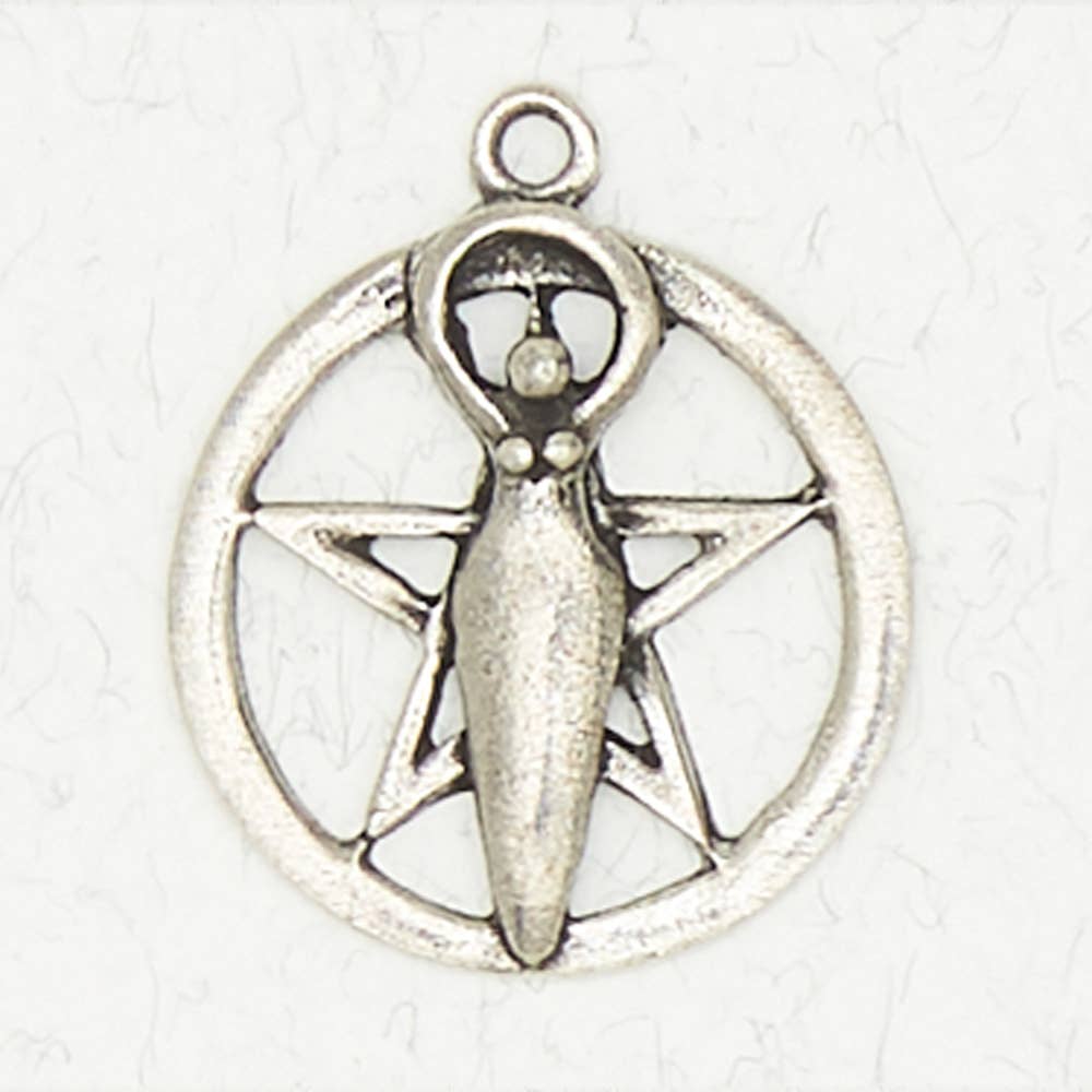 EARTH MOTHER -The Goddess Collection - SPIRAL GODDESS The spiral is a symbol of the upward development of the human spirit. The Woman with her hands above her head stands for the act of drawing down energy form the cosmos above, especially the moon and the stars. Together, these two powerful symbols evoke the feeling of a prayer to the eternal feminine powers that reside in the heavens overhead; a prayer that one’s spiritual potential be realized, and that one should be an instrument of nurturing and healing, of help to the whole of one’s people. Pendants come on Legend Cards with a 33-inch-long black cord. Fine Lead-Free Pewter. Packaged on Recycled paper cards.