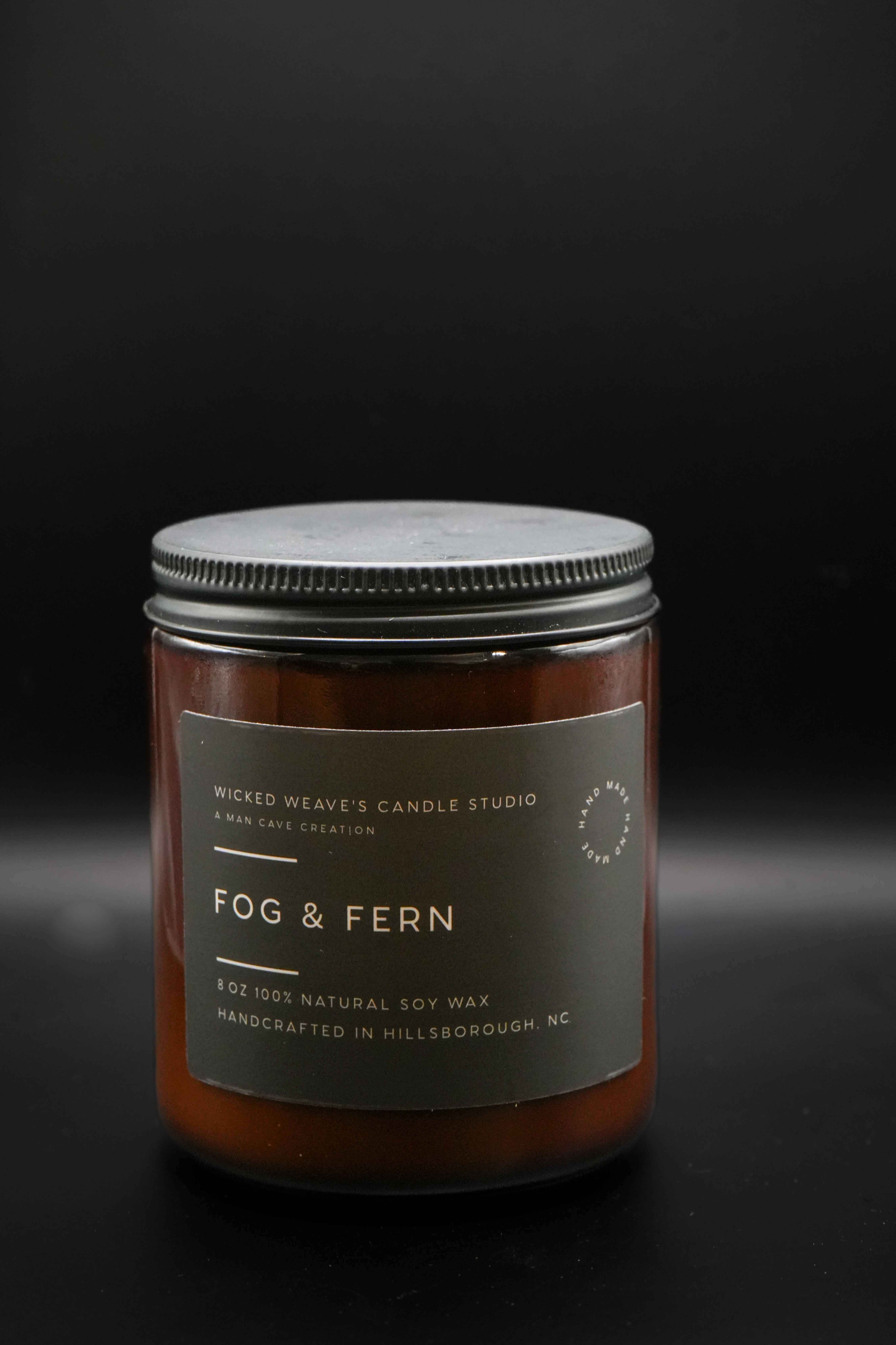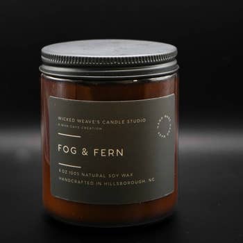 Fern & Fog Journey through a misty forest. This refreshing scent replicates the meditative atmosphere of cloud-covered woodlands cleansed by rain. This scent opens with a fresh breath of bright bergamot, leading into a soothing aromatic heart of lavender and mint. At the base rests green moss, mineral-rich earth, and a touch of juniper. All-natural soy candle. Also available as a spray. Cotton core wick, no phthalates. 16 oz Jar - 80 hour burn time, 8 oz Jar - 50 hour burn time, 4 oz Tin - 25 hour Burn Time.