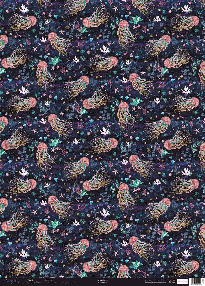 Dive into the deep hues of enchanting colors. Midori’s Jellyfish Gift Wrap design captures the vibrant glow of one of Earth’s most magical creatures. 100% Recycled Cotton Fiber Sustainably Handmade Ten 21"x29" flat sheets per package or Two 21"x29" sheets per retail roll/6 roll minimum per design Keywords: sea creatures, ocean, aquatic, vibrant, snorkel, vacation, summer