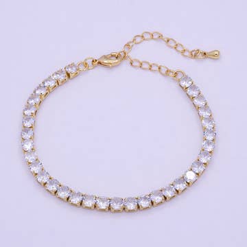 Lobster claw clasp and Round Clear Prong Zircon. This is steel waterproof chain with 18K gold plating. 2mm, 4mm, 5mm Stones. Adjusts to fit most wrists. Stainless Steel. Waterproof The classic Tennis Bracelet. Waterproof. Lobster claw clasp allows more fit options for stacking. The 2mm is the simple stacking Tennis Bracelet