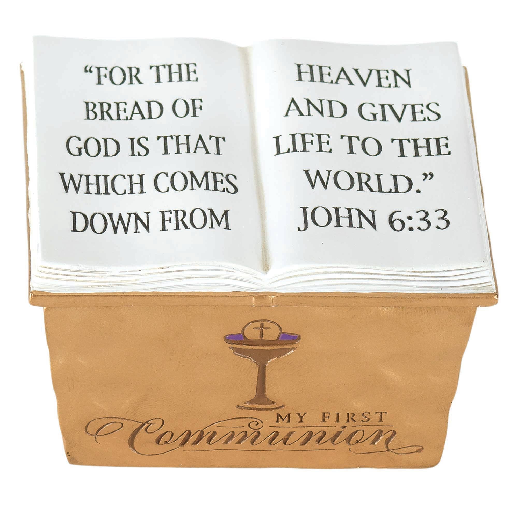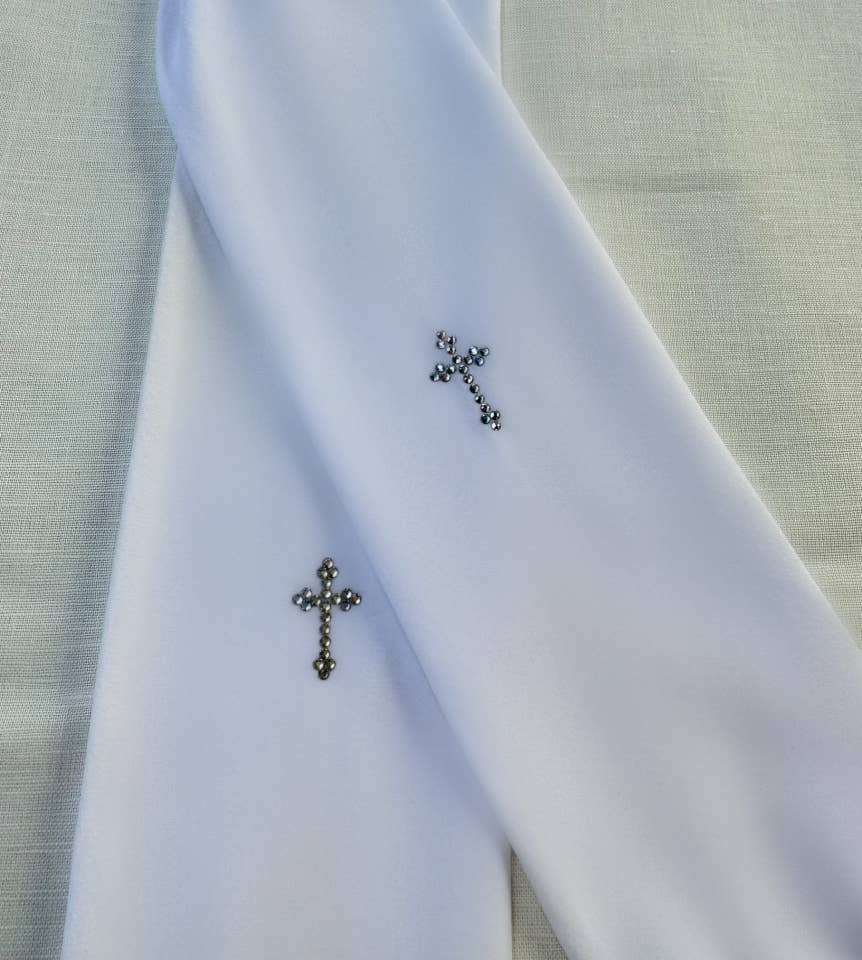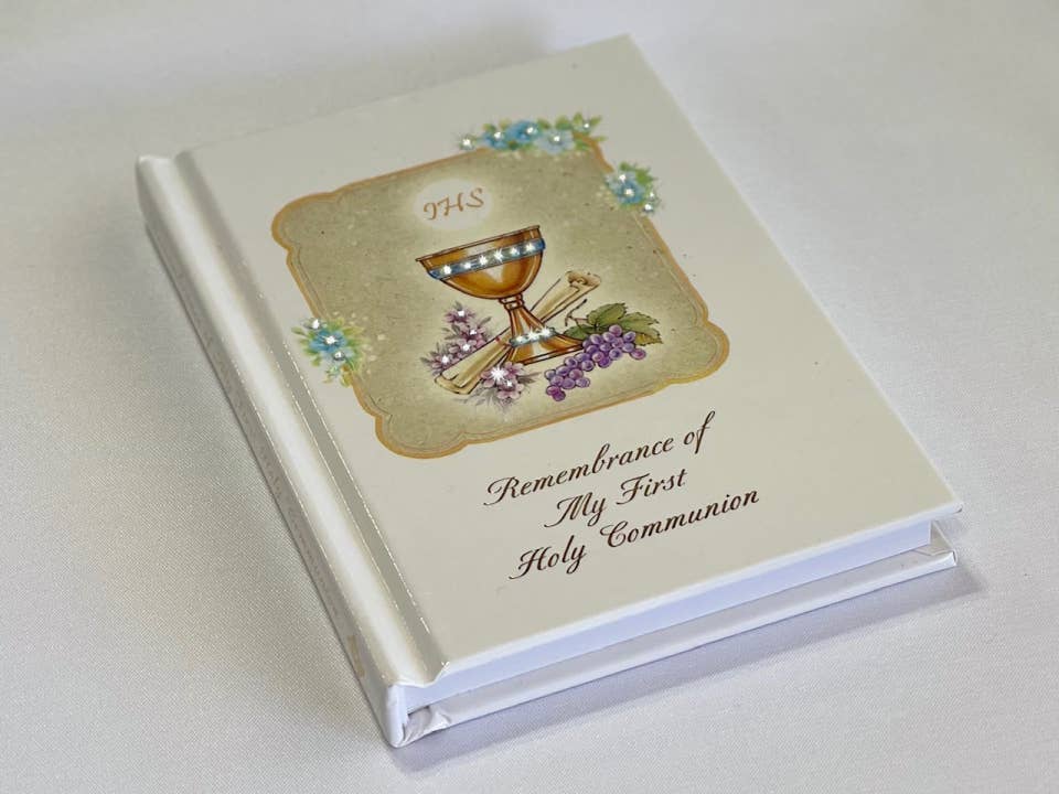 White silk "My First Communion" photo album with ornate cross