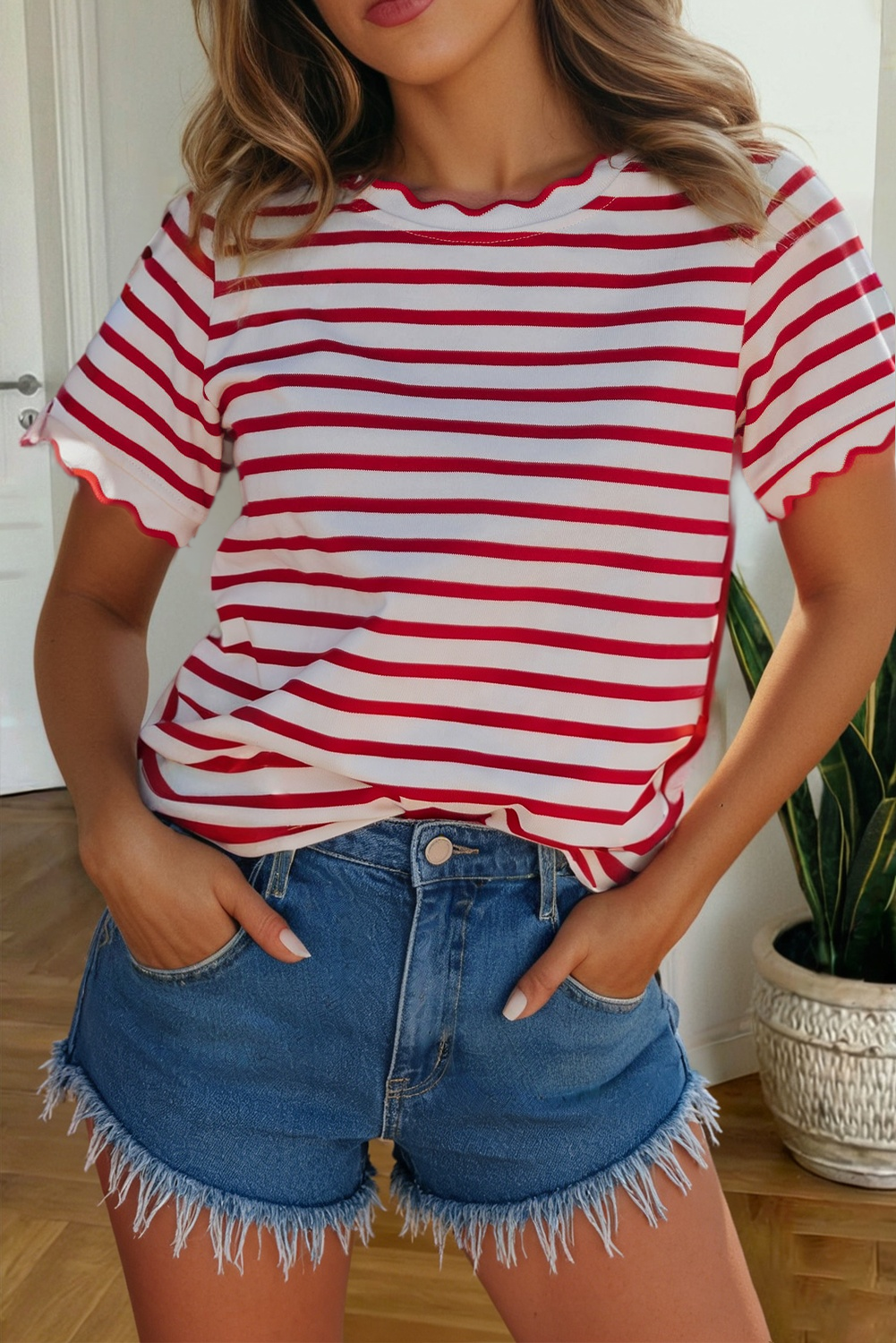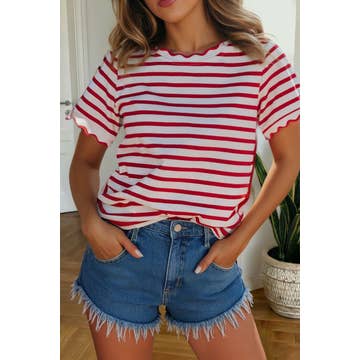 Its sure to be a party in the USA with our Star Spangled Tee! Featuring a soft, lightweight, cream tee with a patriotic serape print on the sleeves and front left pocket, topped with a red neckline. Its the best way to show your pride for the South West and the USA. (Psst--It matches our Wild and Free Shorts perfectly) * 95% Polyester, 5% Spandex * Sizes Small-3XL Western wholesale clothing.