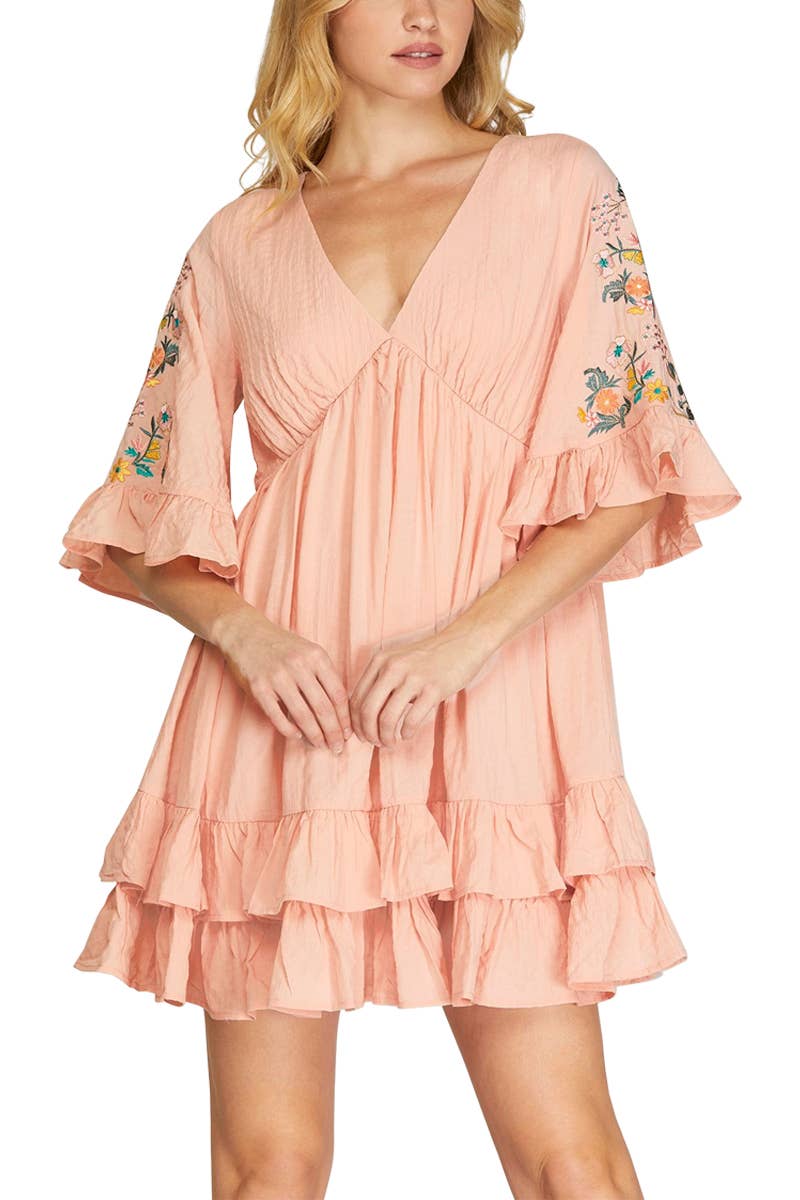 FRONT TIE STRAP SHORT SLEEVE TIERED MINI DRESS
