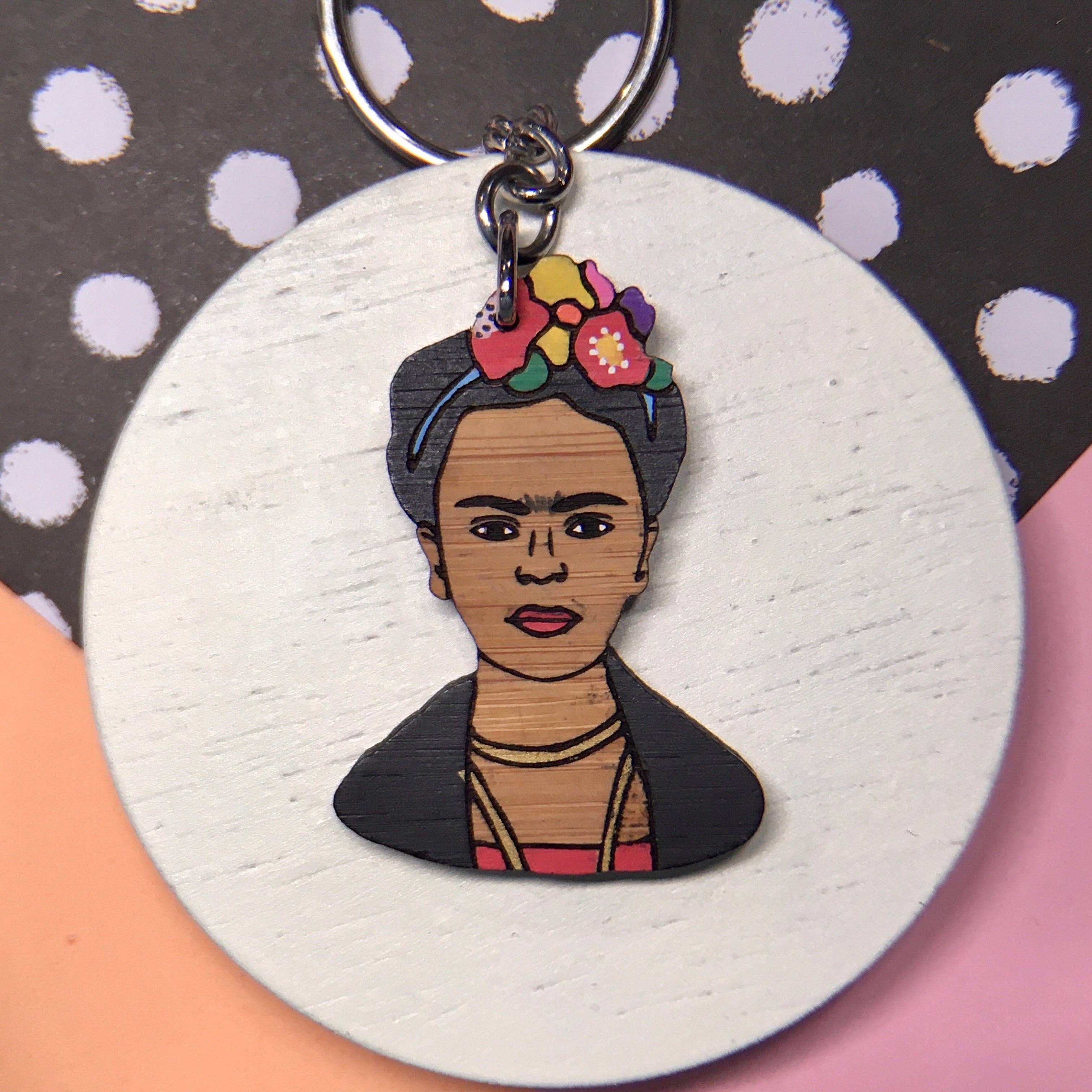 Mexican artist, Frida Kahlo, all decked out in her iconic floral headpiece. * Important Note: Every floral headpiece on the Frida brooch is coloured differently, so your flowers will not not look like the image. An original piece made from sustainably sourced bamboo and individually hand coloured. Some variations in colour detail and bamboo grain will occur. Size: approx. 6.5cm tall and 3.5cm wide.
