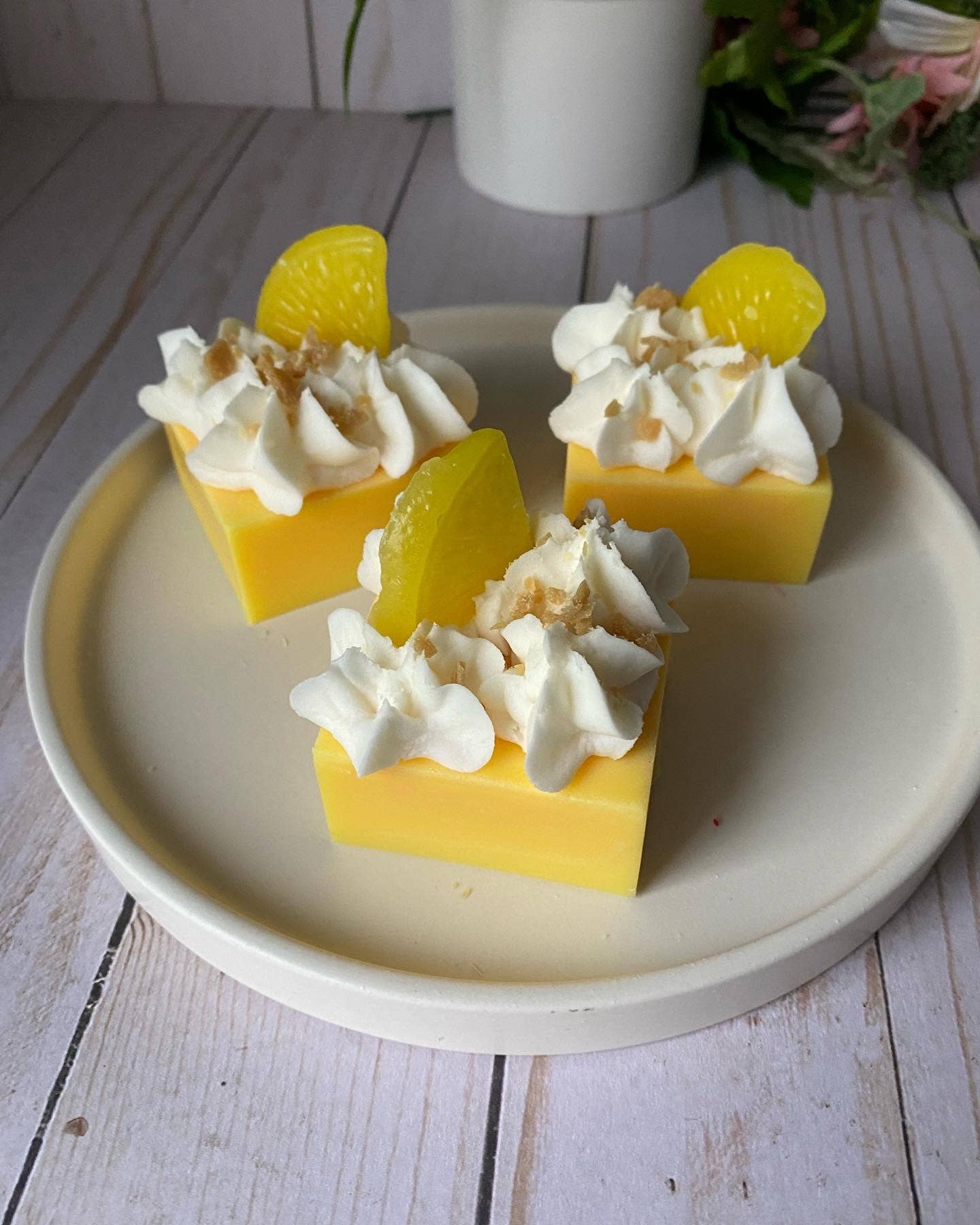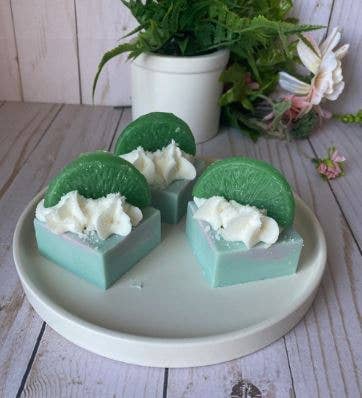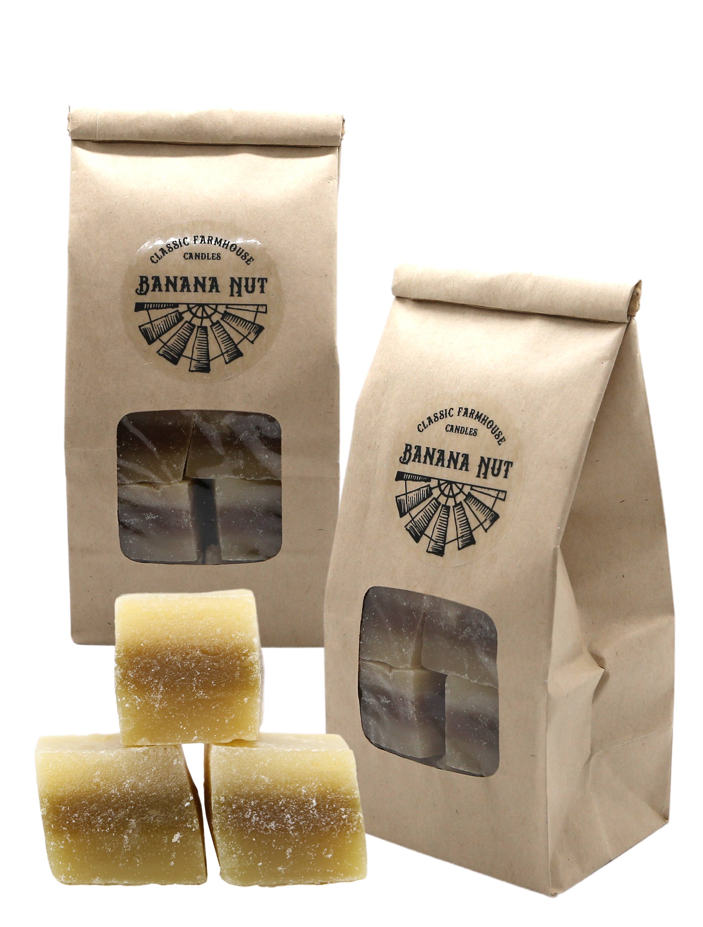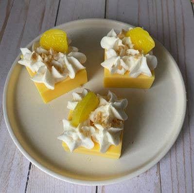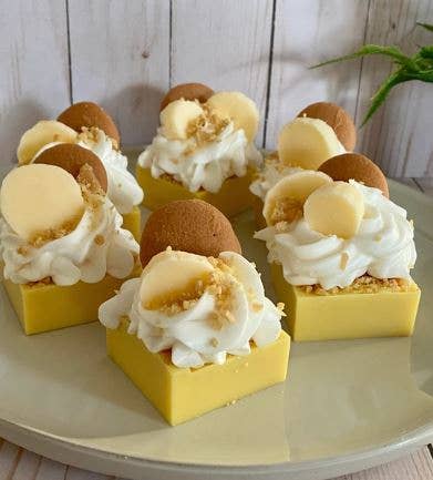Hand poured wax melts in a blend of soy and paraffin wax. Each square weight about 3oz. Each square is a banana cream scented square then topped with wax crumbles, hand piped whipped soy/paraffin wax, more crumbles, a vanilla wax embed and a banana slice wax embed. These are hand by made be me in small batches so each will look a little different but the overall design is the same.
