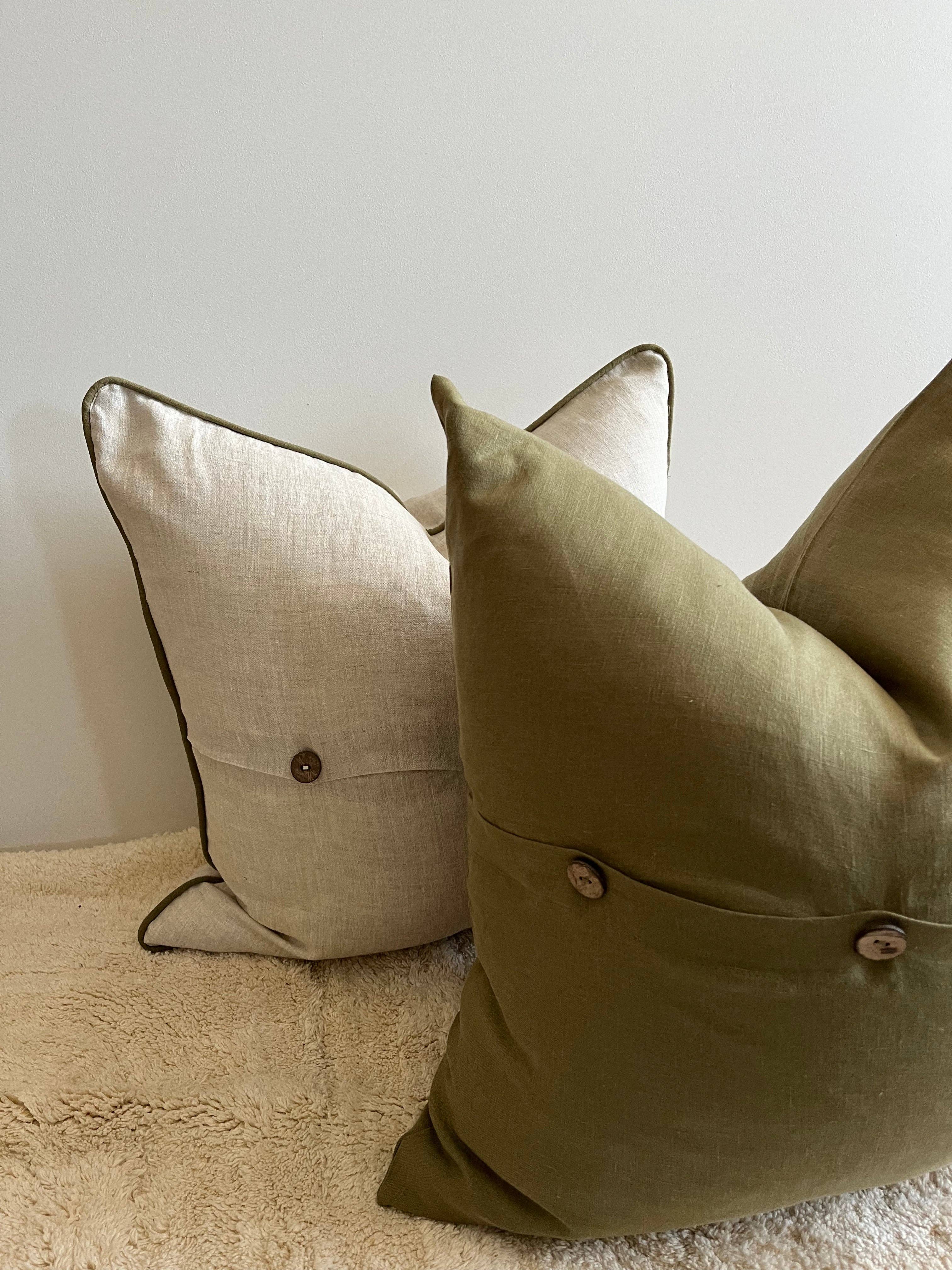 Our Pure French Linen cushion covers with a contrasting piped edge will add a touch of sophistication and elegance to your space. Combining solid colors in your arrangement is a great way to add a polished finishing touch to your decor, the 3 coconut buttons featured on one side of the cover add a warm earthy tone. Match the color of the piping with other decor elements in your room to give a balanced and cohesive look. Size - 50 x 50cm with contrasting piped edge No insert, Just the cushion cover OEKO-TEK certified (no nasty chemicals). 100% Pure French Flax linen Care: Please wash before first use on a cold gentle cycle. Do not tumble dry, best to naturally. Do not dry clean as it weakens the fibres.