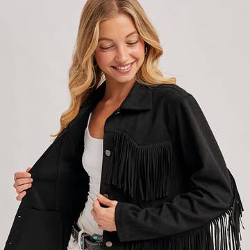 A FAUX SUEDE JACKET WITH FRINGE. A MID HIGH LENGTH COAT, THE JACKET IS A FUN WESTERN TWIST TO FASHION. THE JACKET HAS A BUTTON FOR CLOSURE AND A LAPEL. THE JACKET COMES IN BLACK AND CAMEL BROWN