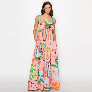 - Retro tropical vives color - Cute resort maxi dress - Shoulder tie detail / Turquoise color tie with cotton tassel - Pockets on side seam - Back smocking - STYLE # - LWD2899 * HPS - 58" SELF - 100% COTTON