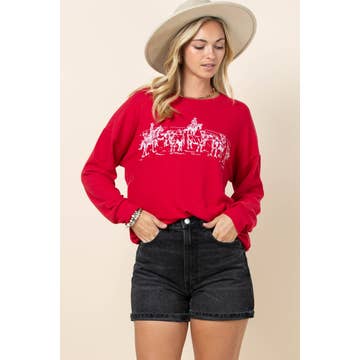 A conversation piece with epic style. Inspired by the timeless equestrian pastime of fox hunting; we created a sweatshirt with comfortable elegance. A charming fox hunter adorns the front, actively in pursuit of a sly fox hiding over your shoulder. A classic relaxed silhouette with a ribbed crew collar, cuffs, and hem. This is truly an equestrian's wardrobe essential. • 50% cotton, 50% polyester • fit: boyfriend, size down for slimmer fit small 2/4 medium-6/8 large-10/12