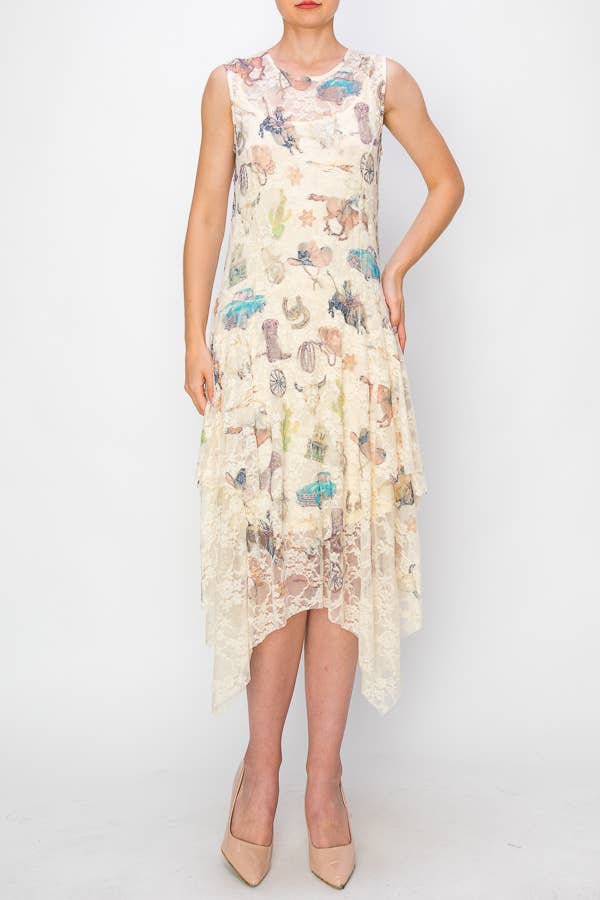 Whimsical Sleeveless Lace Midi Dress With Unattached Slip - 4609 BG/GRN ROSE