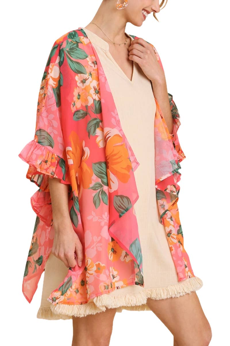 *Marionette* Experience the essence of elegance with our lightweight kimono, crafted from a blend of lurex fabrics that offer a touch of subtle shimmer. Embrace the vivacity of colorful tropical prints combined with ethnic patterns, creating a unique fusion that's truly captivating. Adorned with a charm that's hard to resist, this kimono is a lovely addition to any ensemble. *100% Viscose *APPROX. L 38" W 40" 8.85oz *Imported