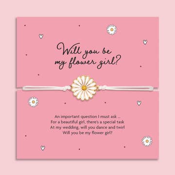 An important question I must ask … For a beautiful girl, there’s a special task At my wedding, will you dance and twirl Will you be my flower girl? Make your flower girl feel extra special with our adorable "Will you be my flower girl?" bracelet. Featuring a beautiful daisy charm on a soft white adjustable cord, this bracelet is a perfect way to ask that important question with a sweet, personal touch. Children should be supervised at all times whilst wearing this bracelet, not suitable for children under the age of 3 due to small parts. Product Details One size fits all Bracelet Material - Zinc alloy, copper and polyester Size Group - Adult (children to be supervised when wearing due to small parts) Colour - White and yellow Charm - Flower Daisy approx. 2cm Sentiment - Wedding Dimensions - Approx. 28cm (adjustable) Closure type - Sliding knot