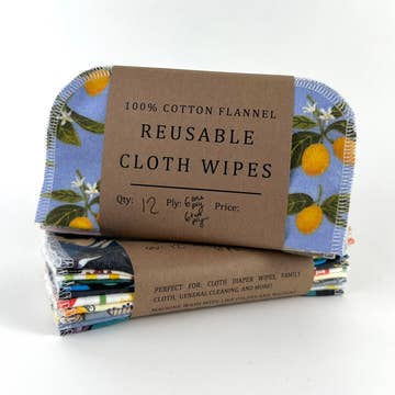 Reusable cloth wipes are great alternative to single use disposables. Uses include: diapering infants, household toilet paper alternative, cleaning cloths, reusable tissues, or stack in your home for easy cleaning. Note sure which 'ply' you prefer. This sample pack is a great opportunity to try our 1-ply & 2-ply wipes. This product listing is for a pack of six 1-ply wipes and six 2-ply wipes. 1-ply refers to one layer of cotton fabric per wipe, 2-ply refers to two layers of cotton fabric per wipe. Fabric is 100% cotton flannel and each pack comes with a variety of fabric patterns. Care instructions: Place used wipes in a wet bag and be sure to wash your wipes within a couple days of using them. Machine wash on hot and tumble dry. Wipes will get more absorbent as you wash them. Made by Miche Niche in California.