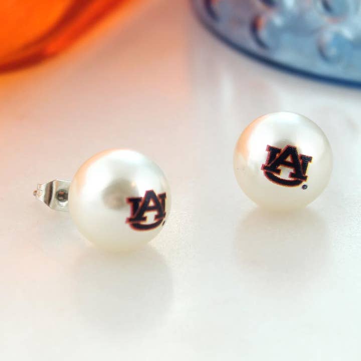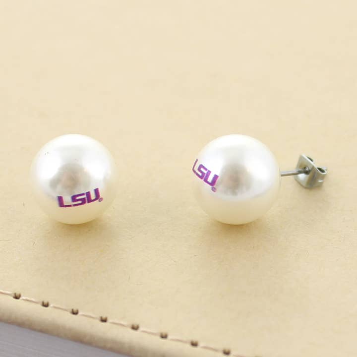 Round 12mm pearl stud earrings featuring the Mississippi logo. This is an officially licensed product.