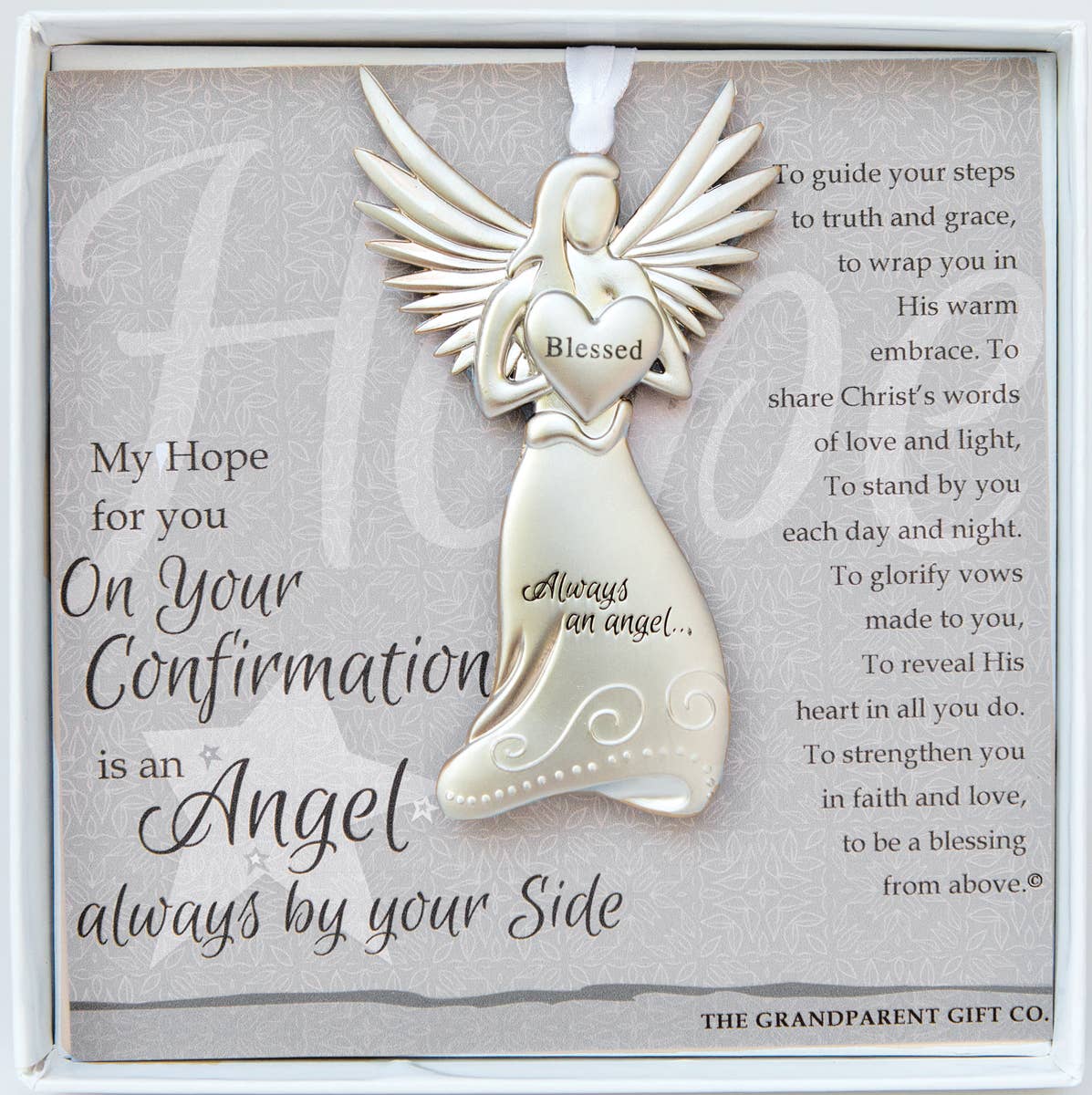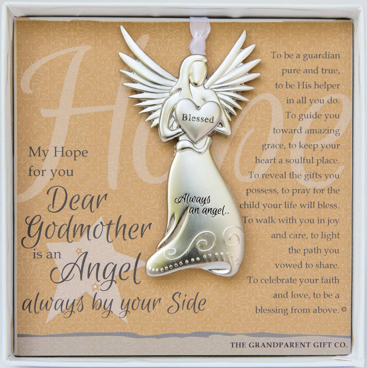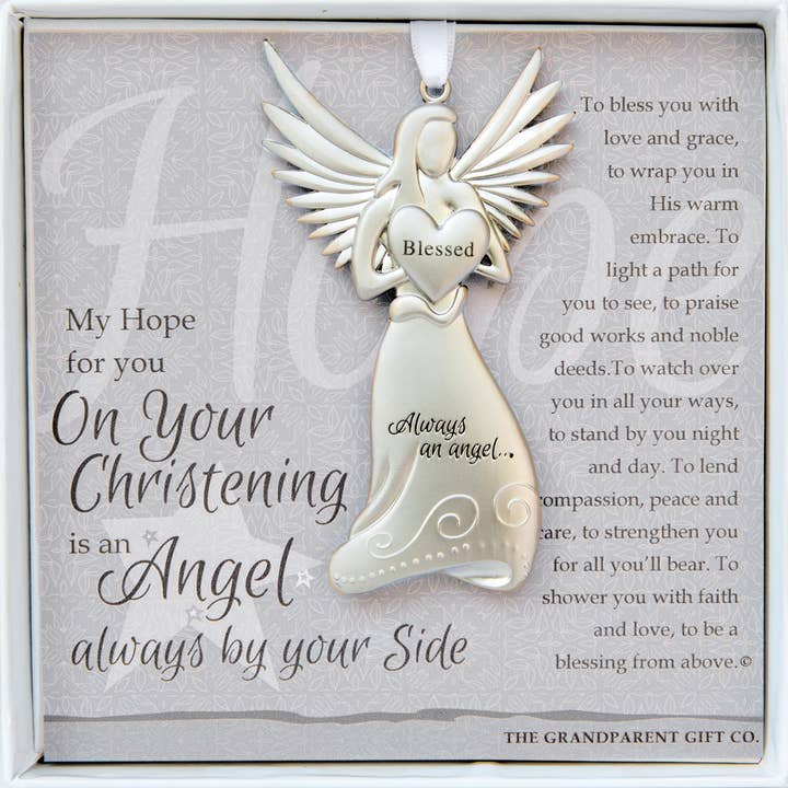 Our beautifully crafted Christening guardian angel ornament makes a Christening keepsake that lasts a lifetime. Measuring 4 x 2.25", our Christening angel comes gift-boxed with artwork featuring words of love for the christened child. Angel medallion hangs on a white satin ribbon and is perfect for year-round display. An ideal gift for Godson or Goddaughter on their Christening, they will always have an angel by their side. Also available in titles for new baby girl/boy, sympathy, godmother, and more! Angel holds a heart that reads "Blessed" and is packaged with sentiment in a white box with a clear lid, 5.5"x5.5".