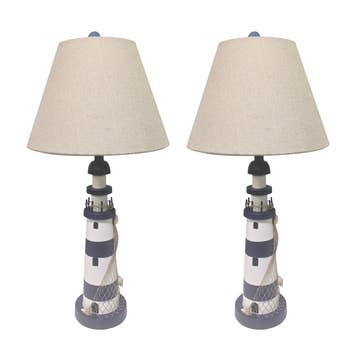 Add a cool contemporary coastal look to any room with this wonderful brushed nickel finish table lamp. Made of metal, the lamp has a weighted base, and a thin cylinder neck. It features a coastal blue 8.5 inch diameter drum style shade with a white starfish print. The lamp measures 18.5 inches tall, and the base measures 5 inches in diameter. It is UL approved and uses one Type A bulb up to 40 watts, and has a 60 inch long power cord. It is great for adding a beachy influence to bedrooms, dorms and living rooms.