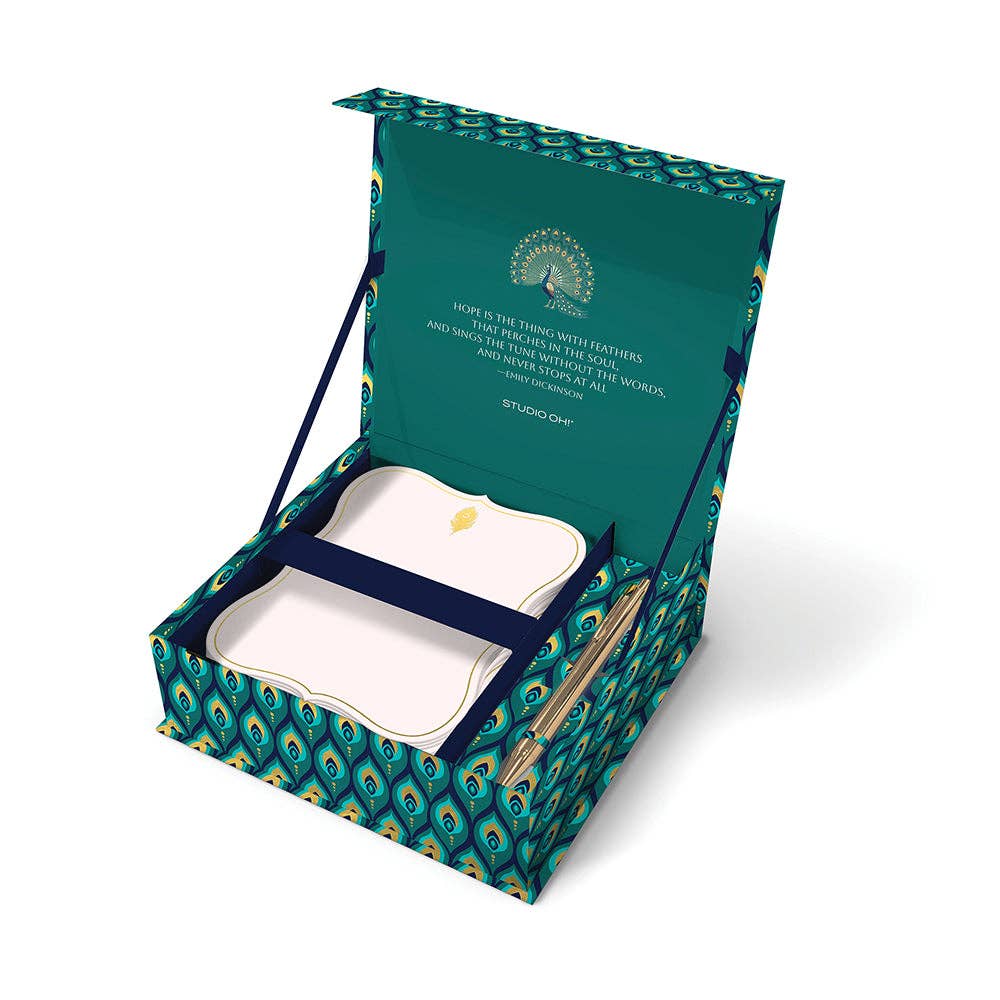Each set comes in a gorgeous gold-foiled keepsake box with magnetic flap closure and includes: -20 gold foil-stamped, ultra luxurious duplexed writing sheets -20 gold metallic-lined envelopes -20 gold foil-stamped butterfly sealing stickers -1 gold beveled ball-point pen Writing sheets and envelopes measure 5" x 7" and sealing stickers are 1" in diameter.