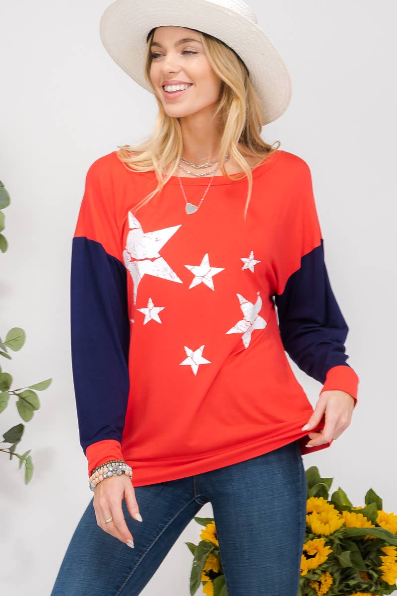 STAR PRINT ROUND NECK DOUBLE RUFFLED TOP WITH ROUND HEM *MODEL IS WEARING SIZE SMALL